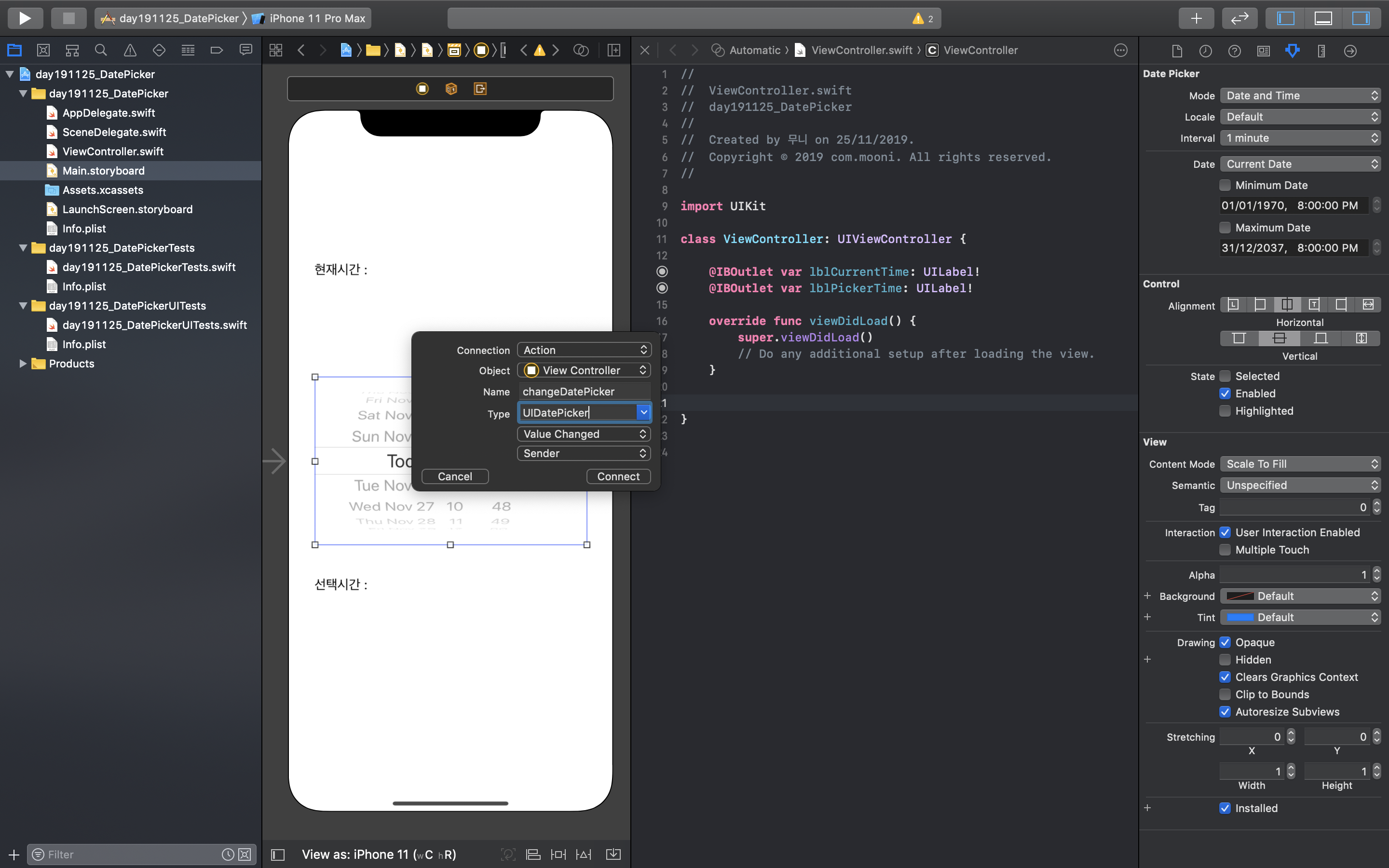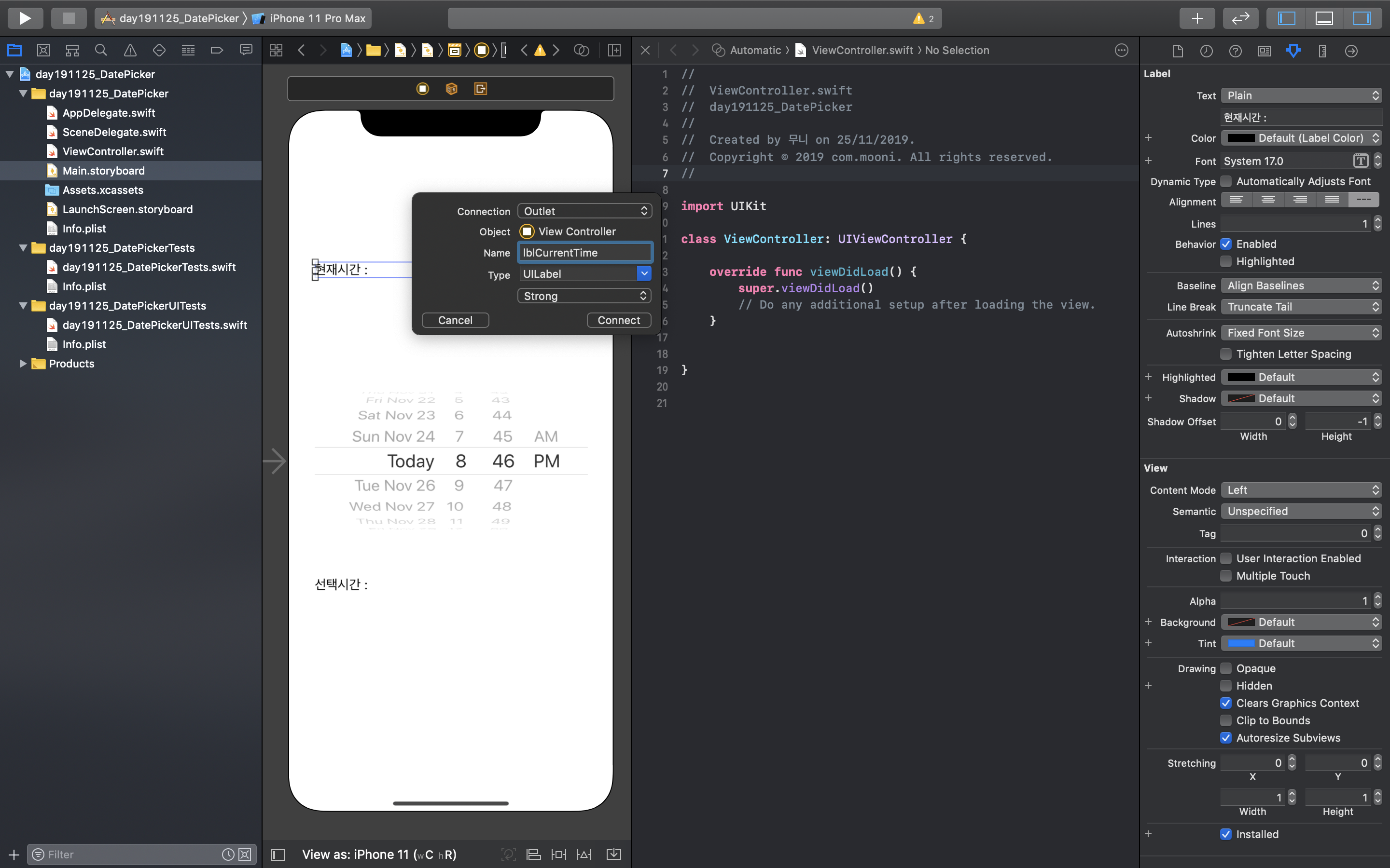 하단 label 이름은 'lblPickerTime' 라고 입력하고, Connect 클릭한다.