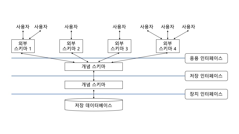- 사용자의 관점에 따라 외부 스키마(External Schema), 개념 스키마(Conceptual Schema), 내부 스키마(Internal Schema)로 나눔