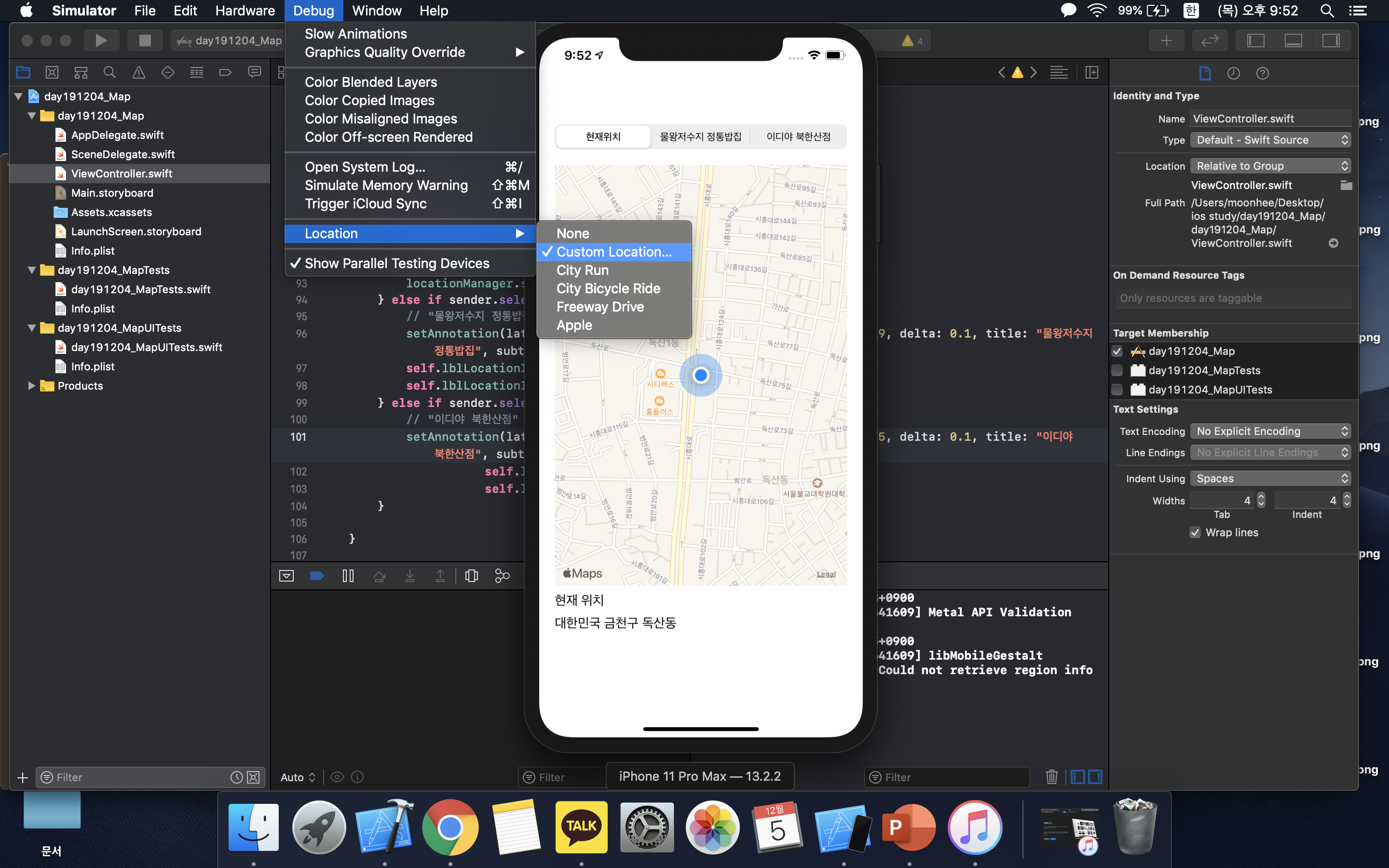 시뮬레이터는 GPS 지원이 되지 않아서 현재 위치를 지정했다.