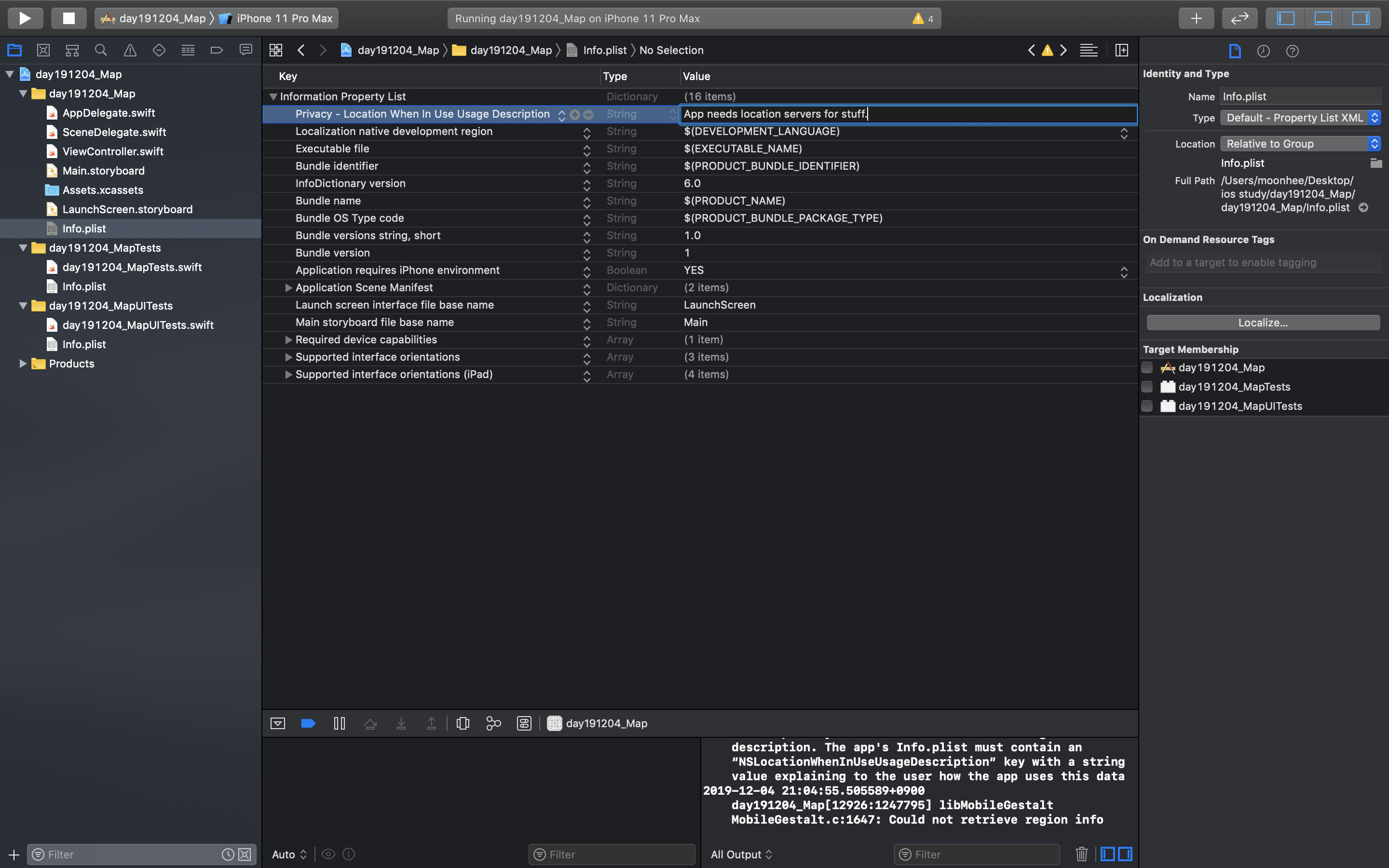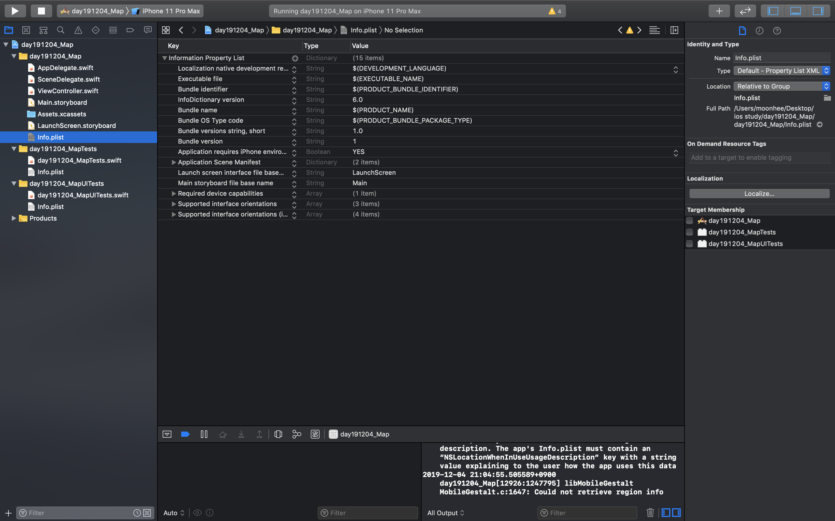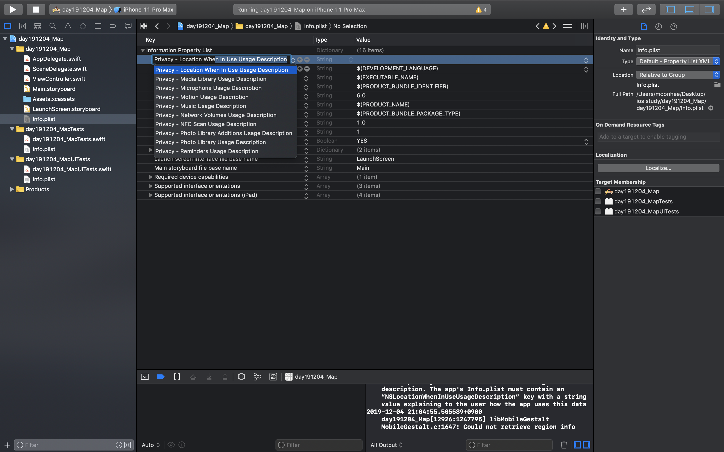 위와 같은 메세지가 있다면, Info.plist을 수정한다. (사진참고)