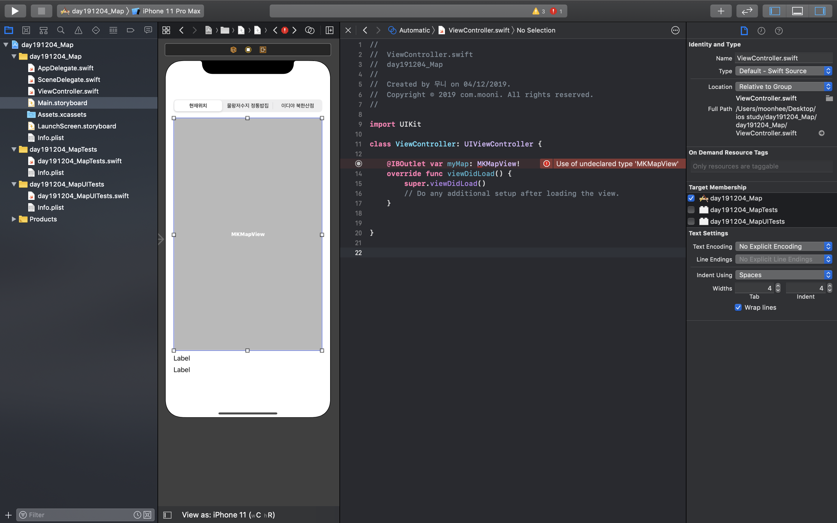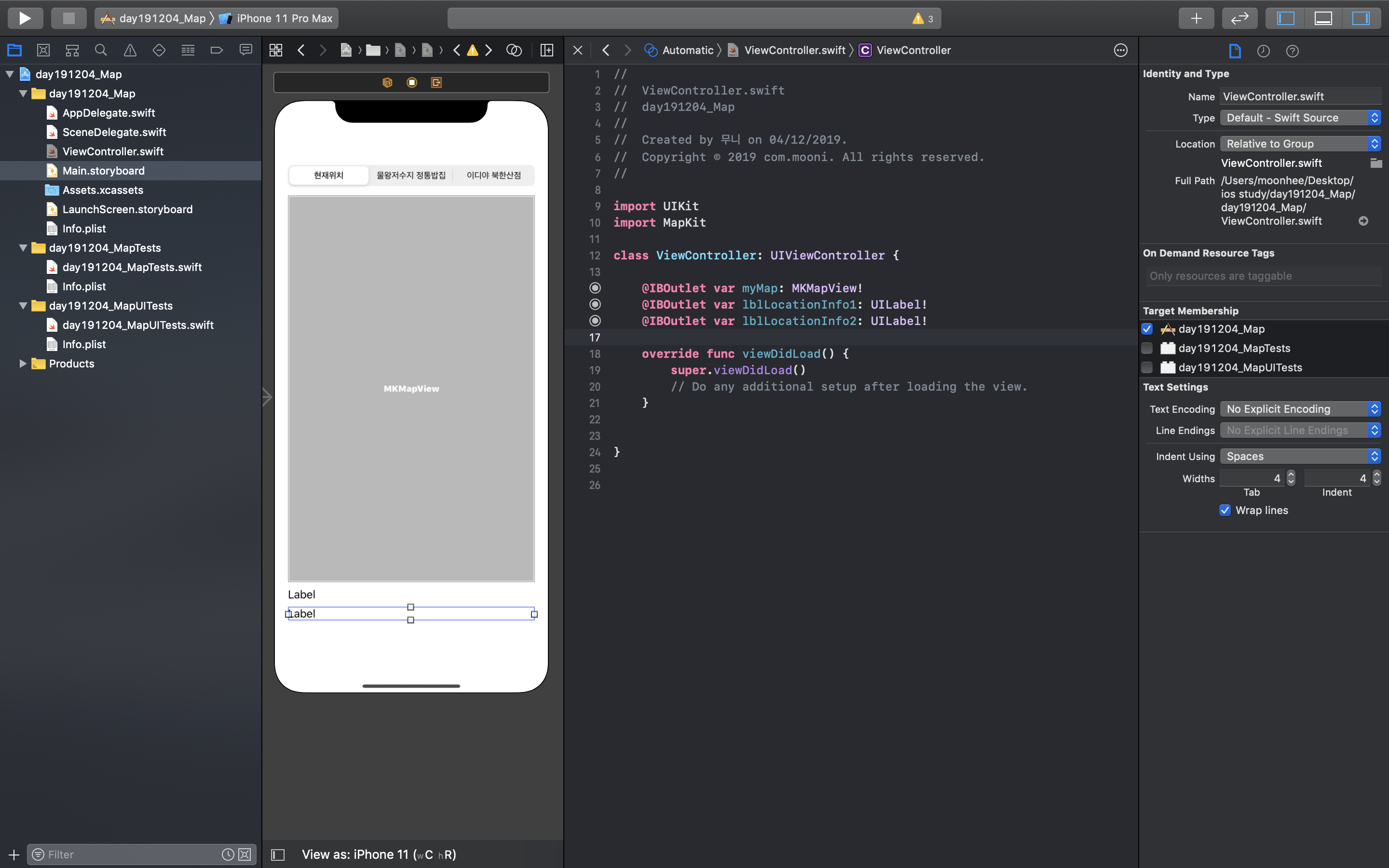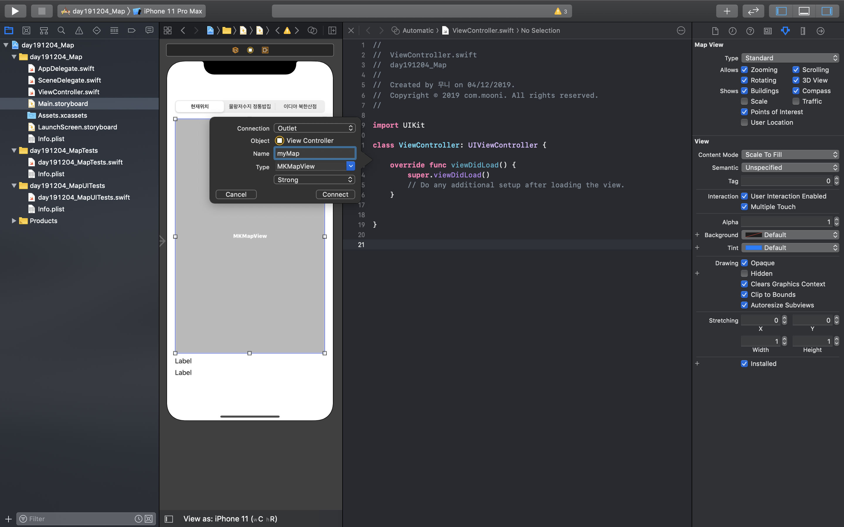 Xcode(버전11.2.1)를 이용하여 맵 뷰(Map View) 지도 앱을 만든다:)