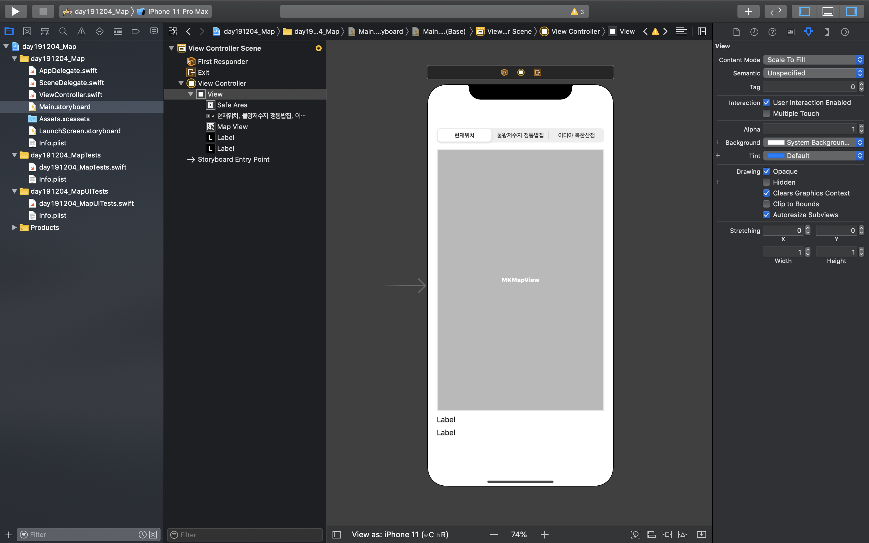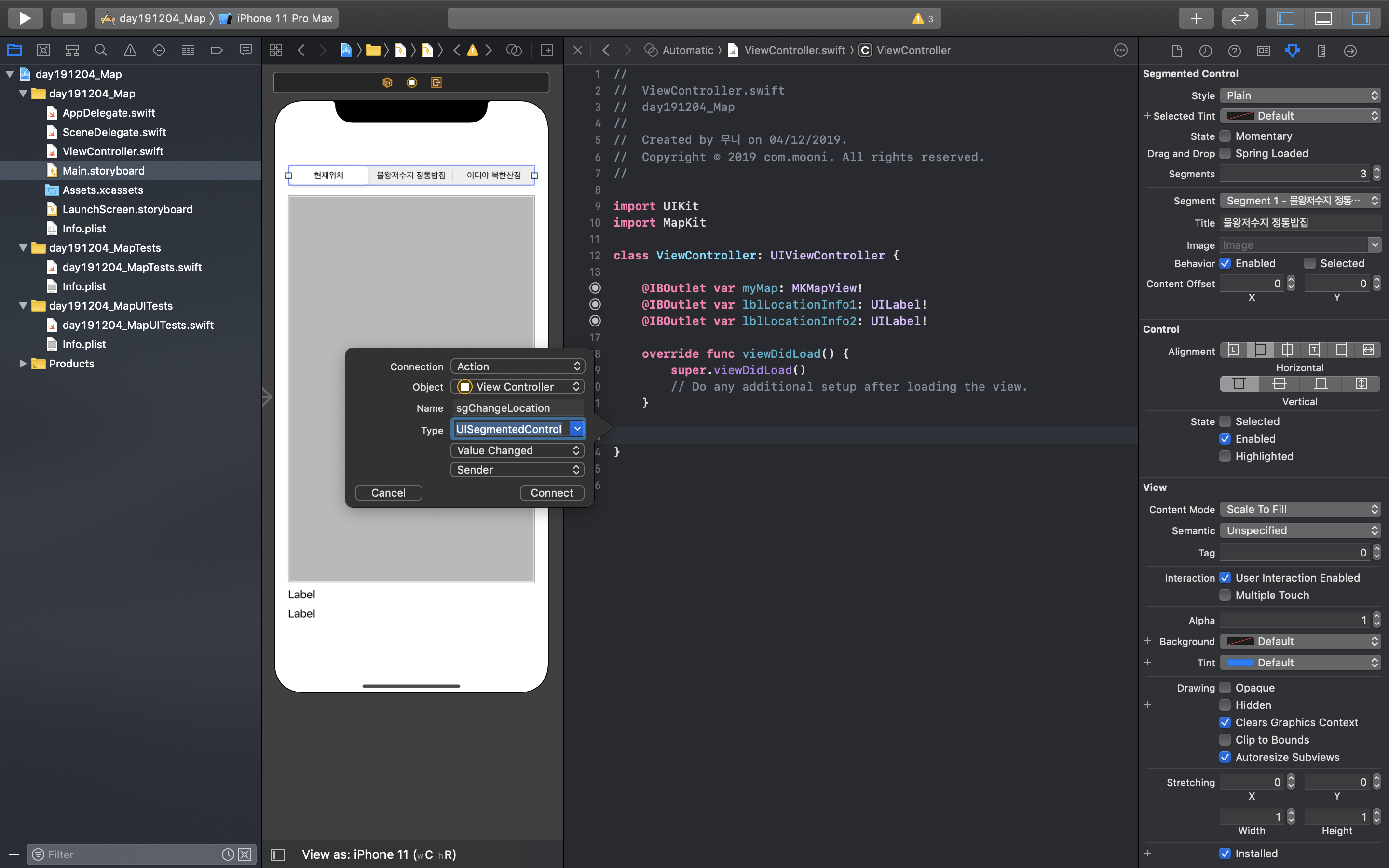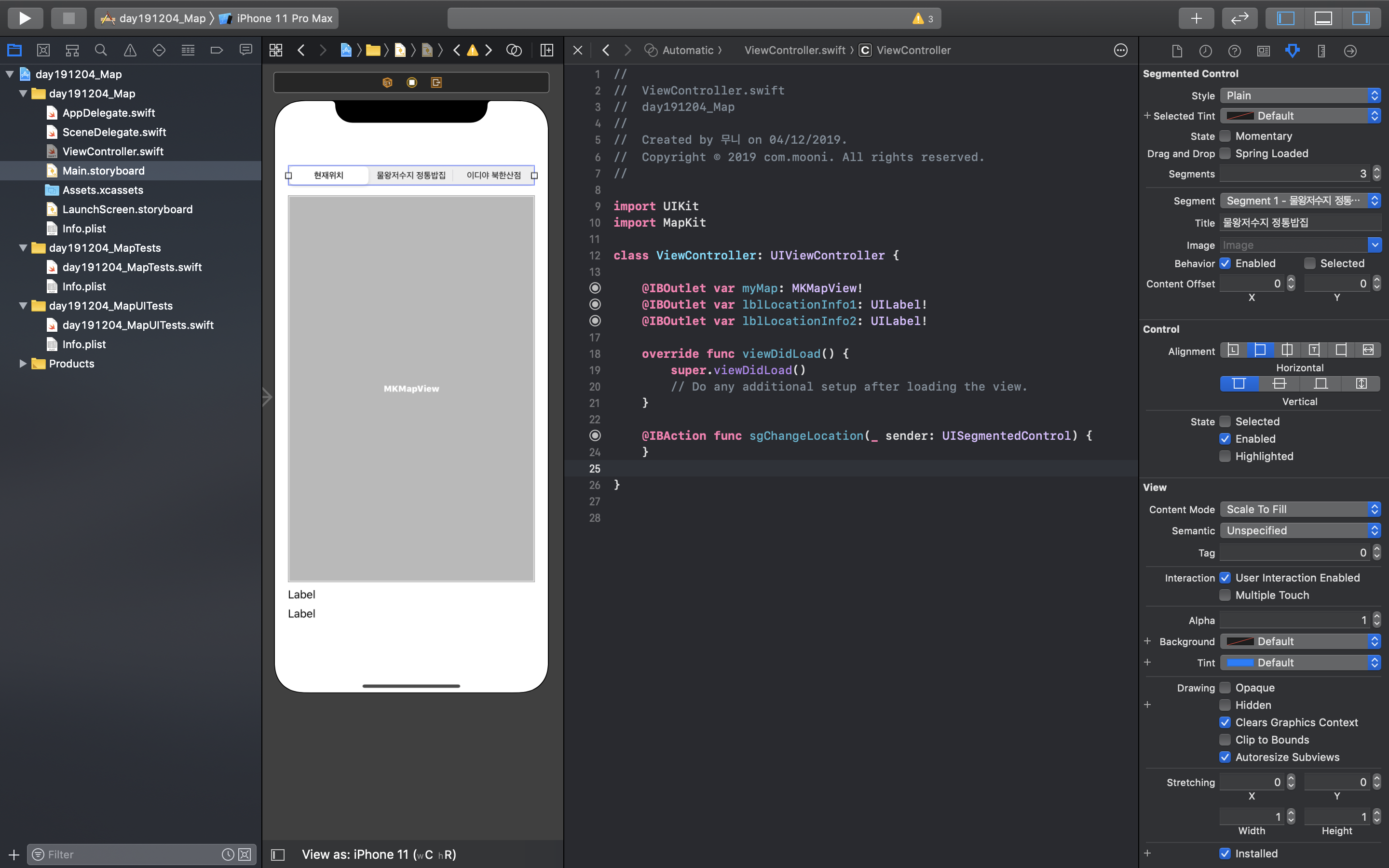 Segmented Control, Map Kit View, Label 을 추가한다.
