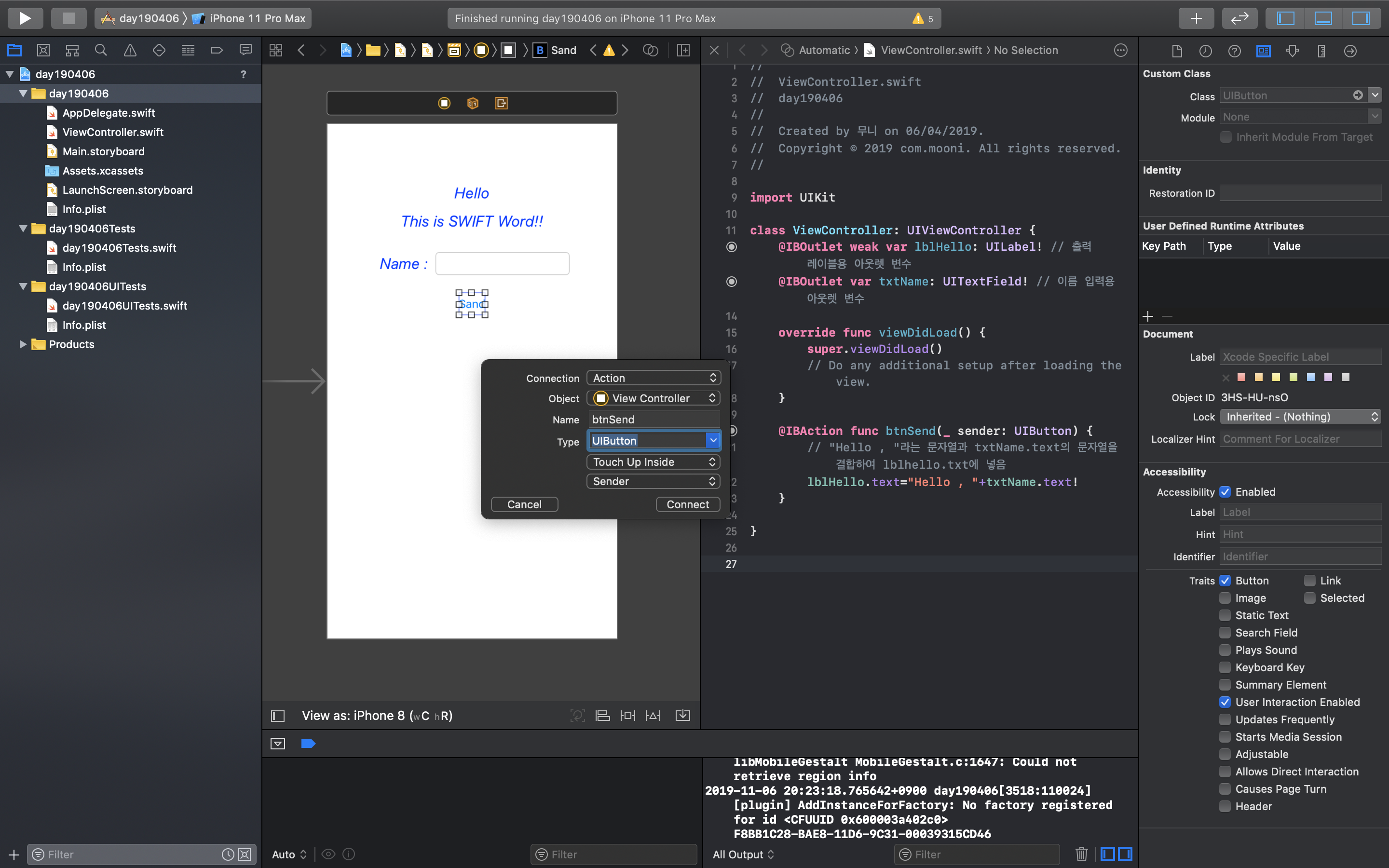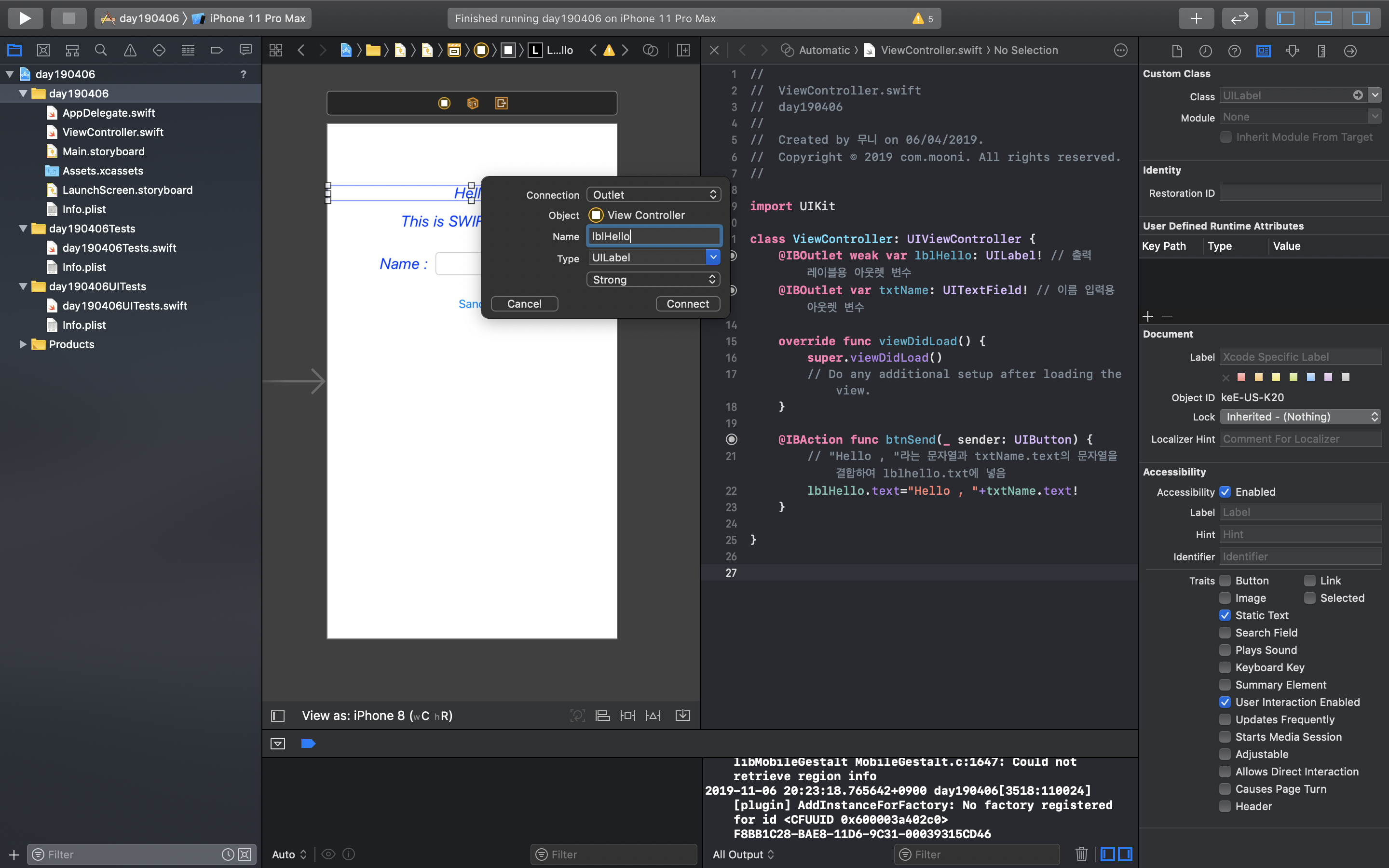 아웃렛 변수의 이름은 'lblHello' 라고 입력하고, Connect 버튼을 클릭하면 Hello 레이블과 아웃렛 변수가 연결된다.