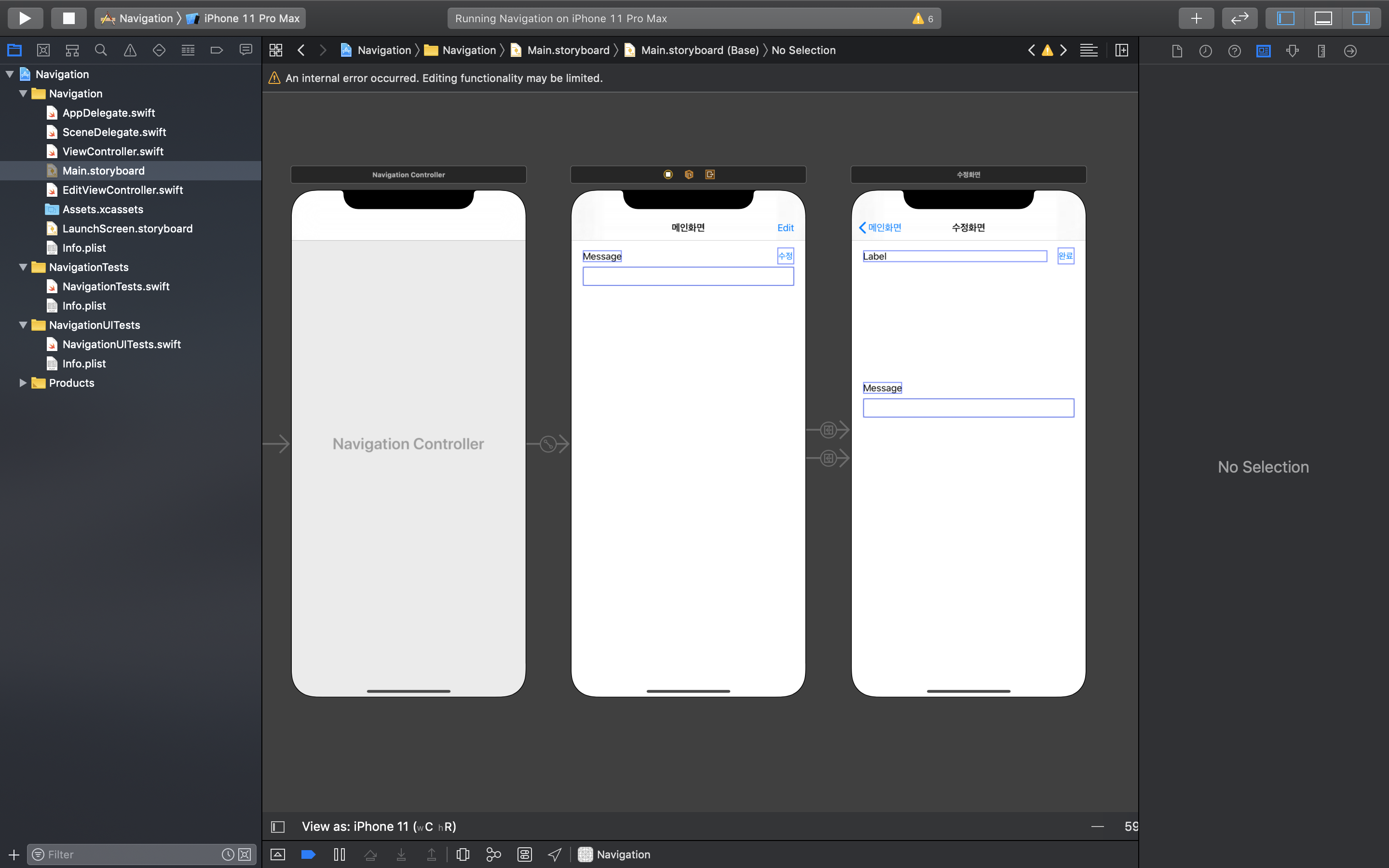 [iOS/swift] Error - an internal error occurred. editing functionality may be limited.