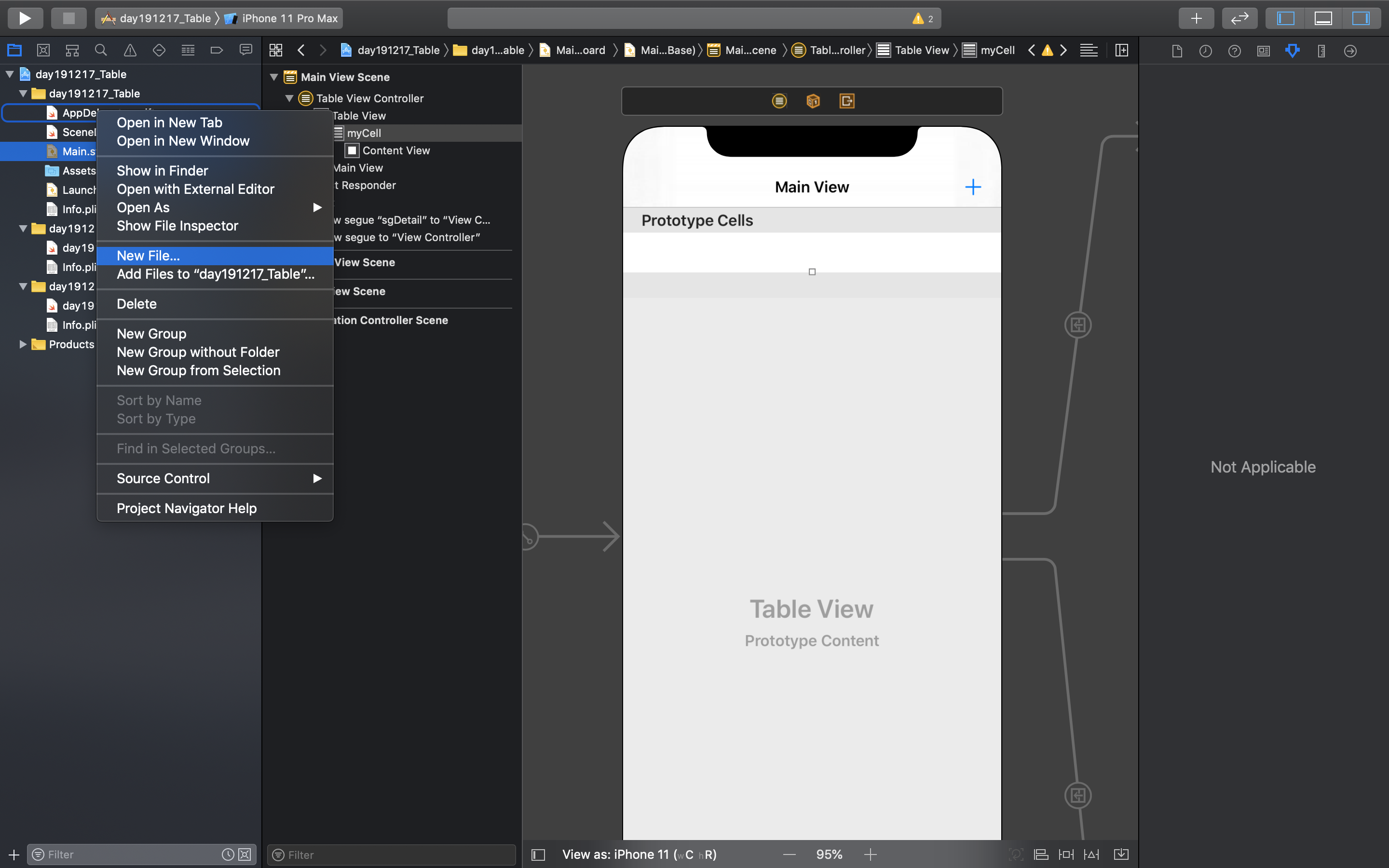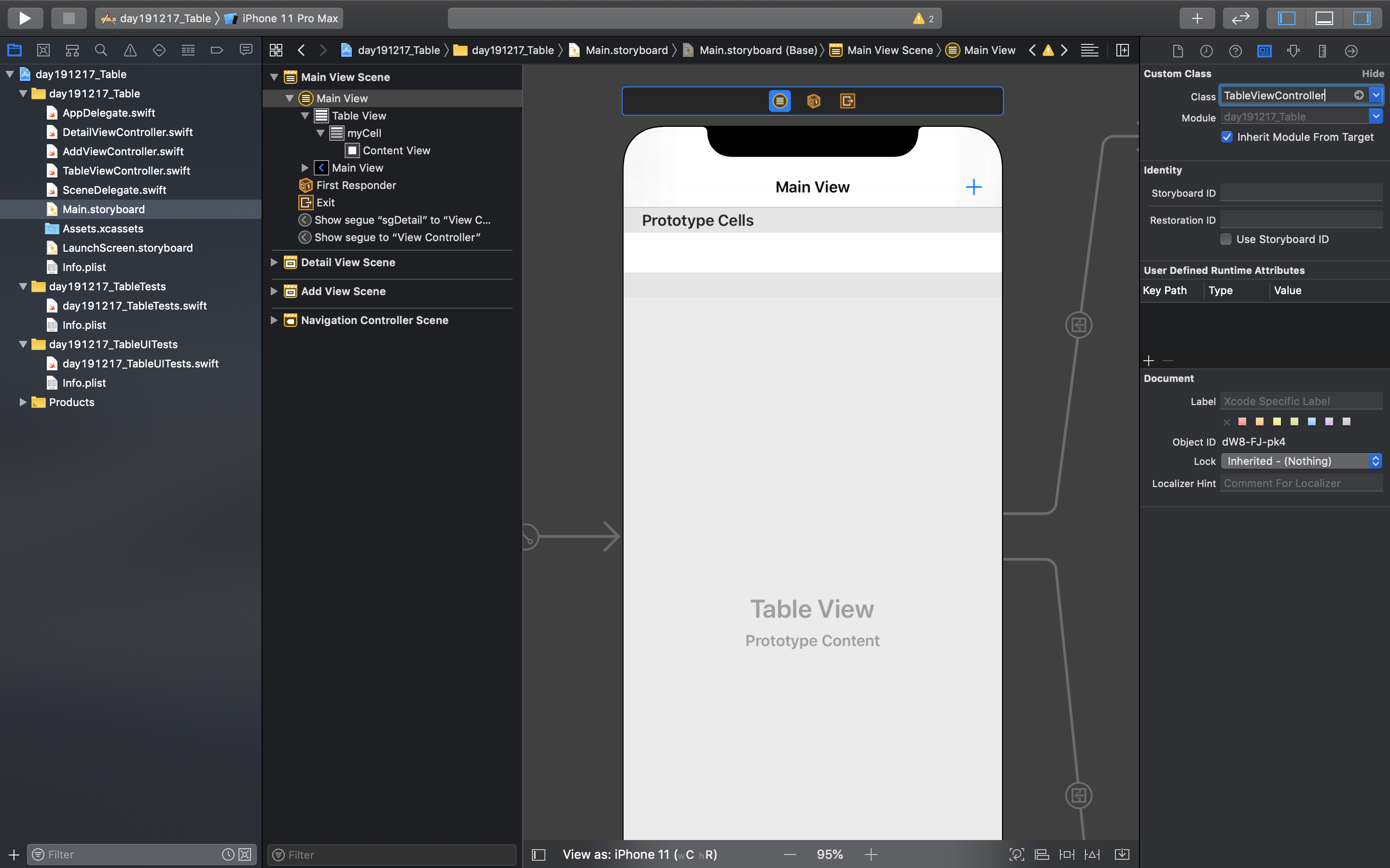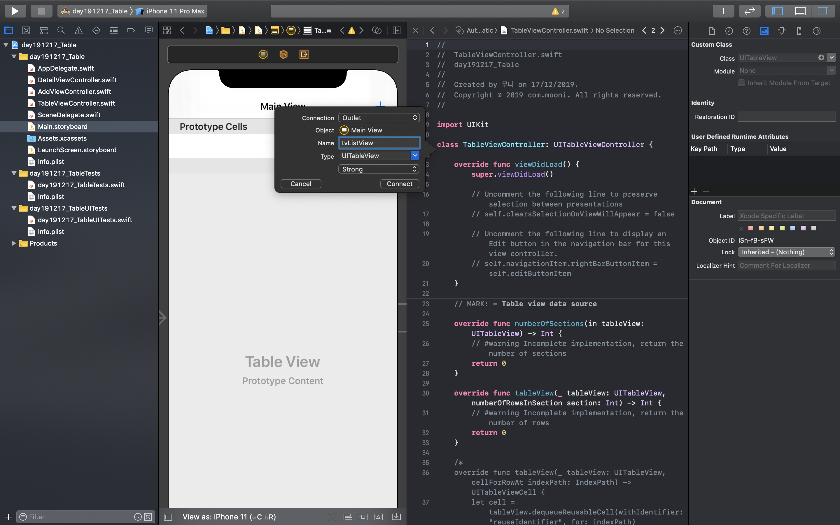 'Main View' Controller -> Identity Inspector -> Custom Class -> Class -> 'TableViewController' 선택
