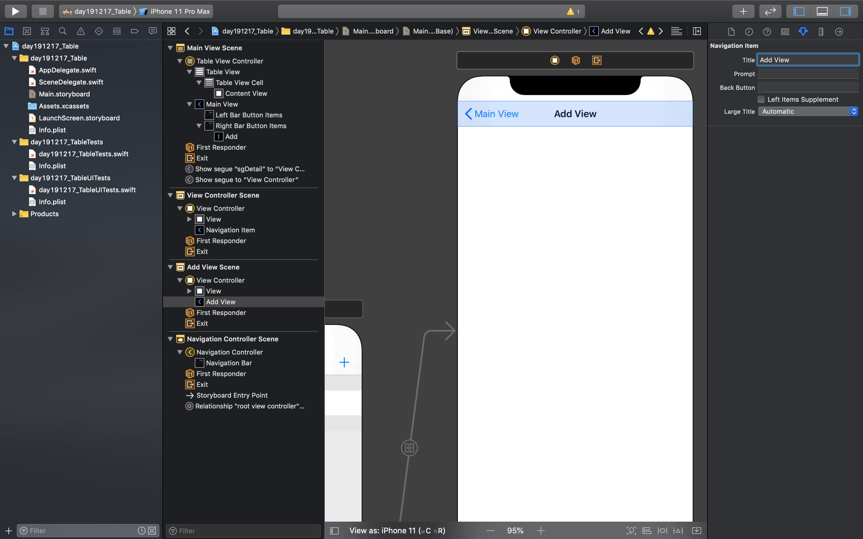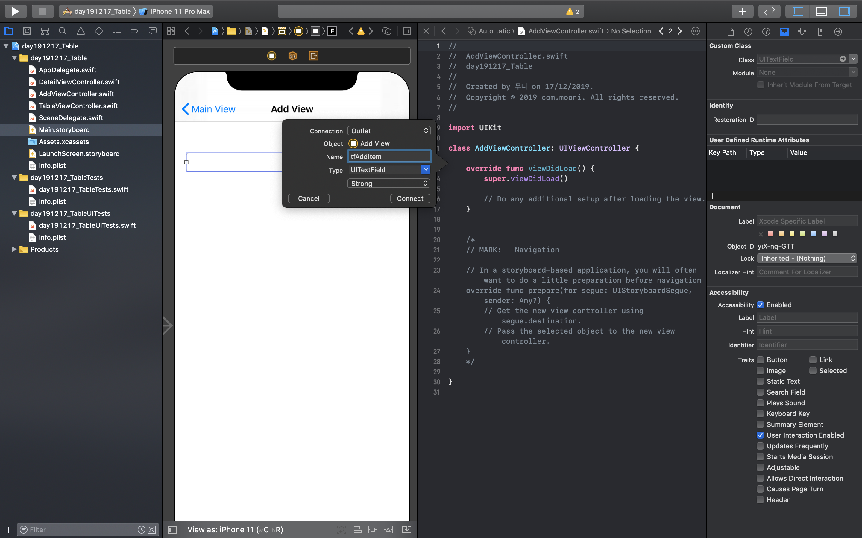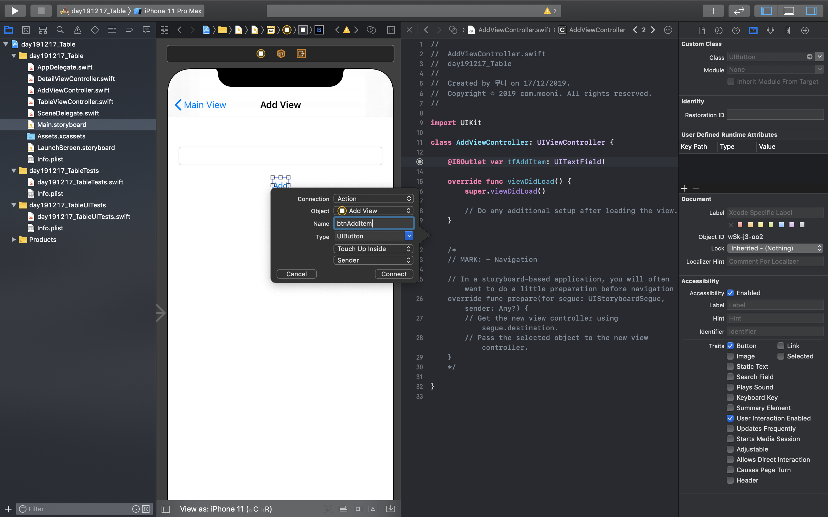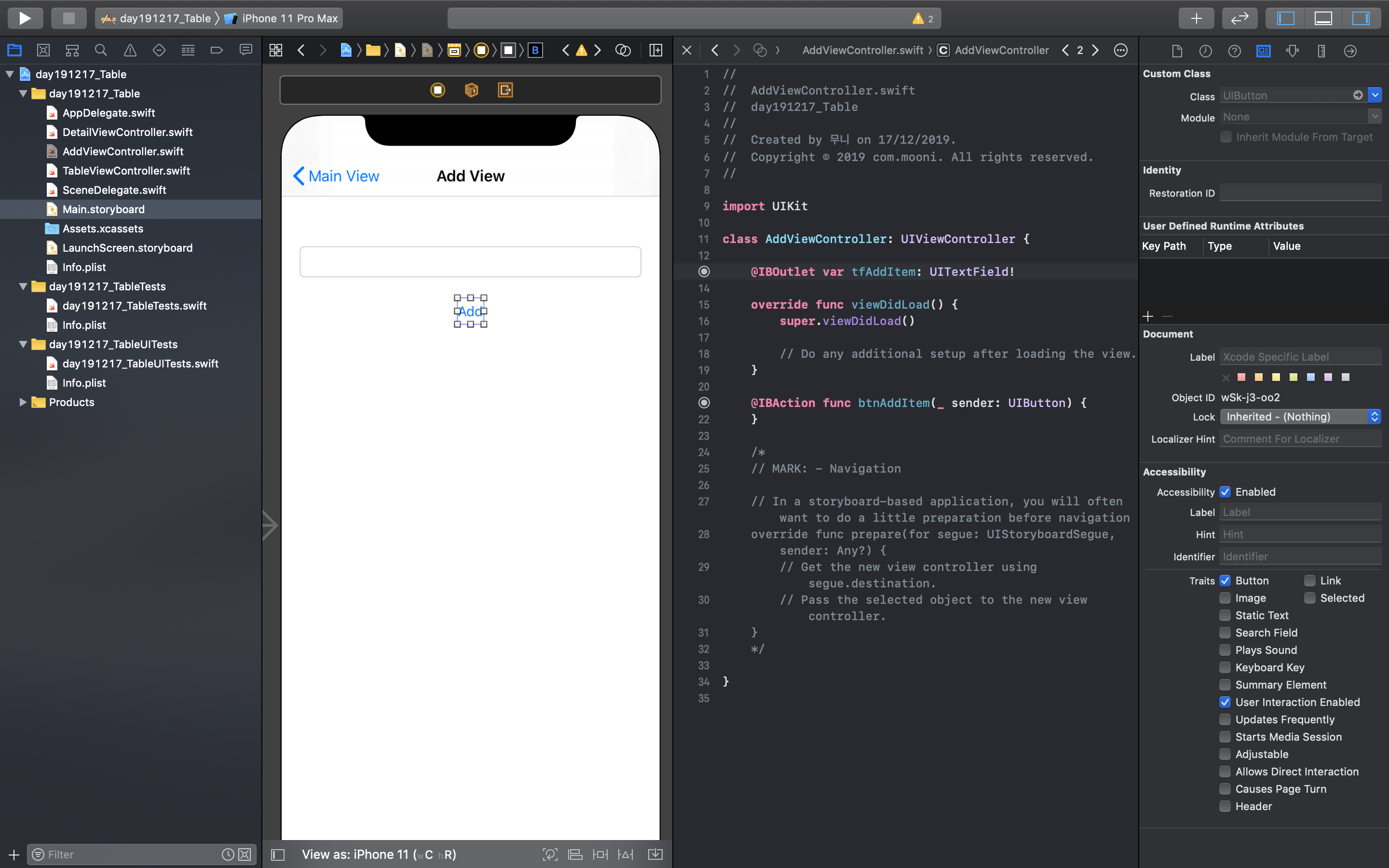 1) 'Add View' 뷰 컨트롤러에 Text Field, 'Add' button을 추가한다.