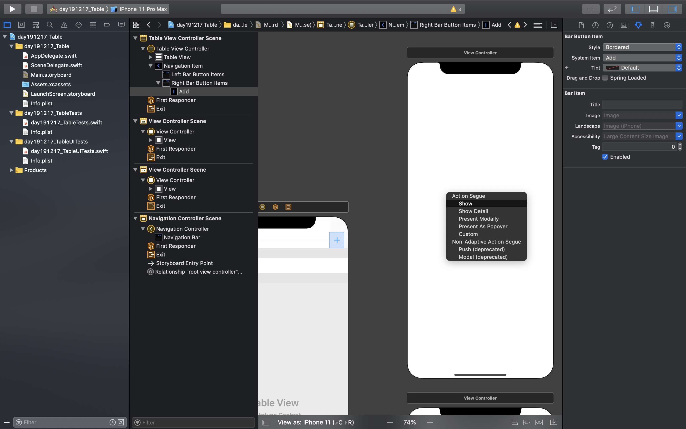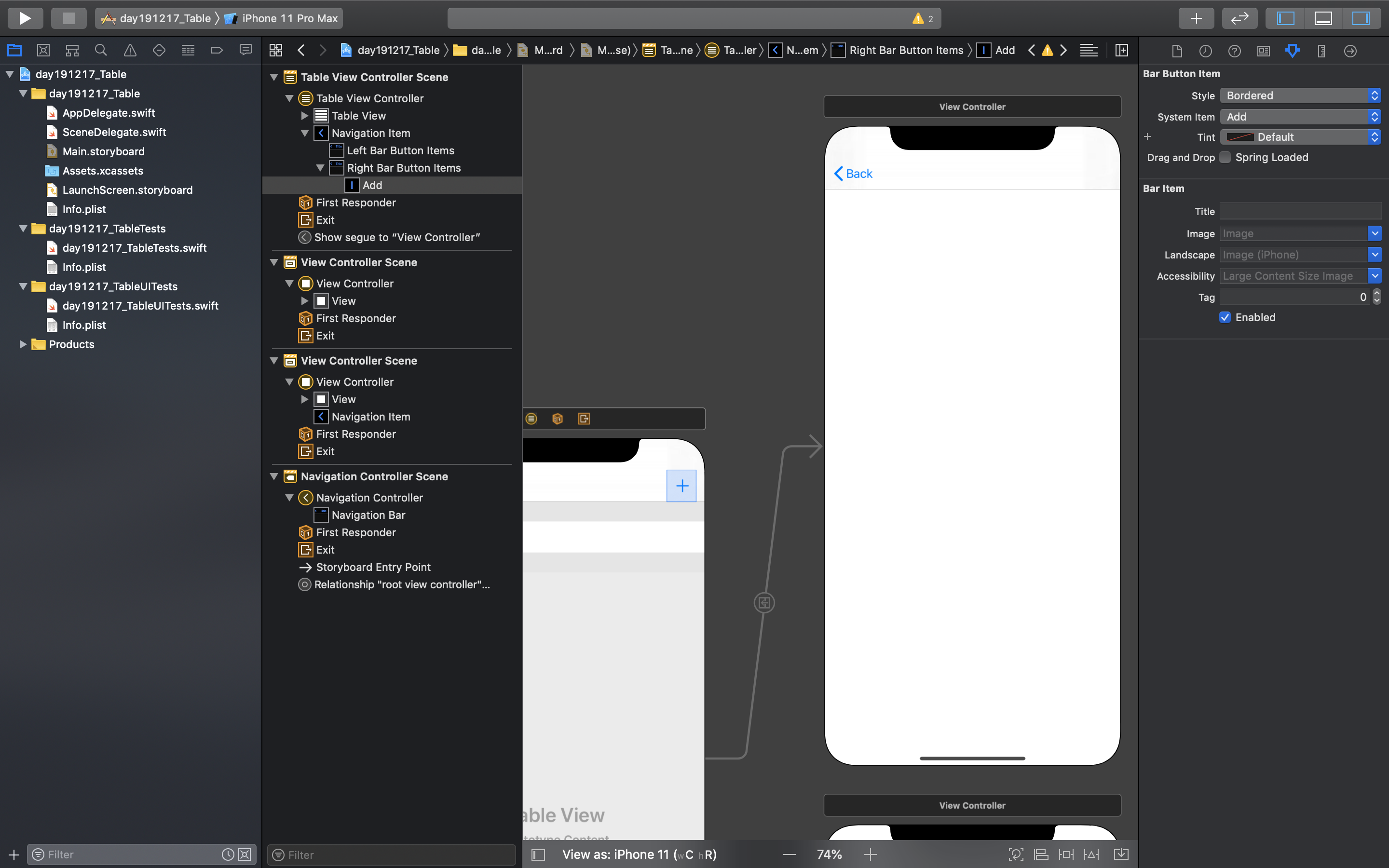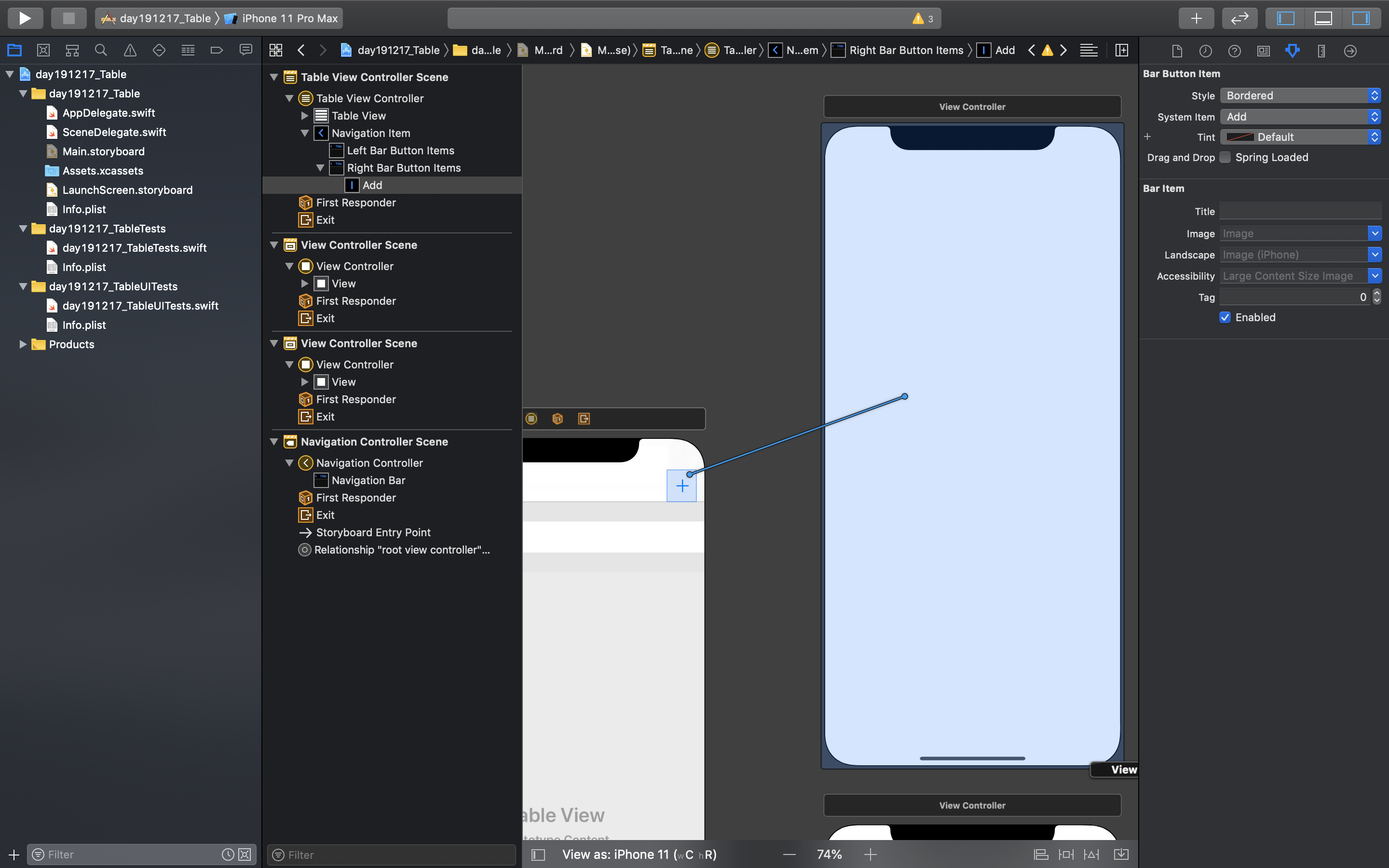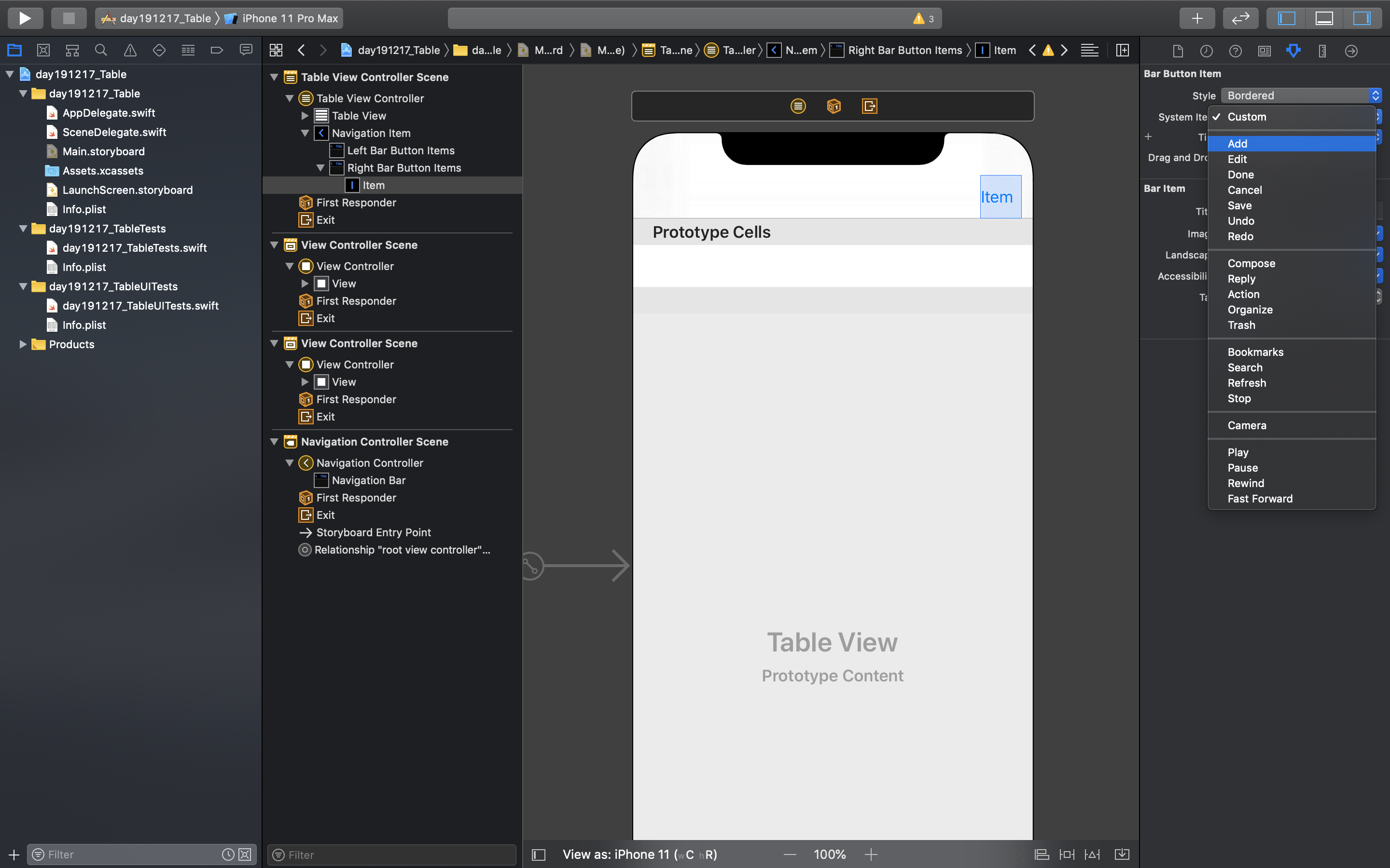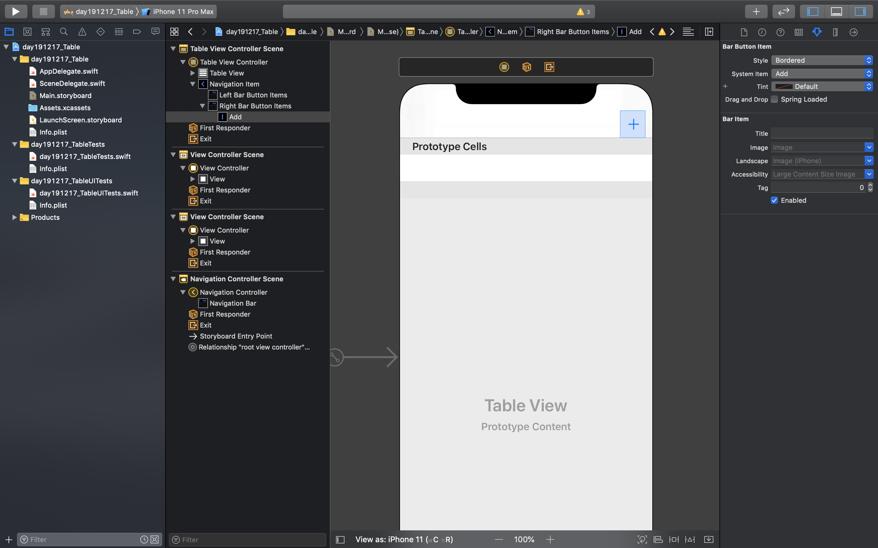 1) 테이블 뷰 컨트롤러(Table View Controller)에 Bar Button Item을 추가한다.