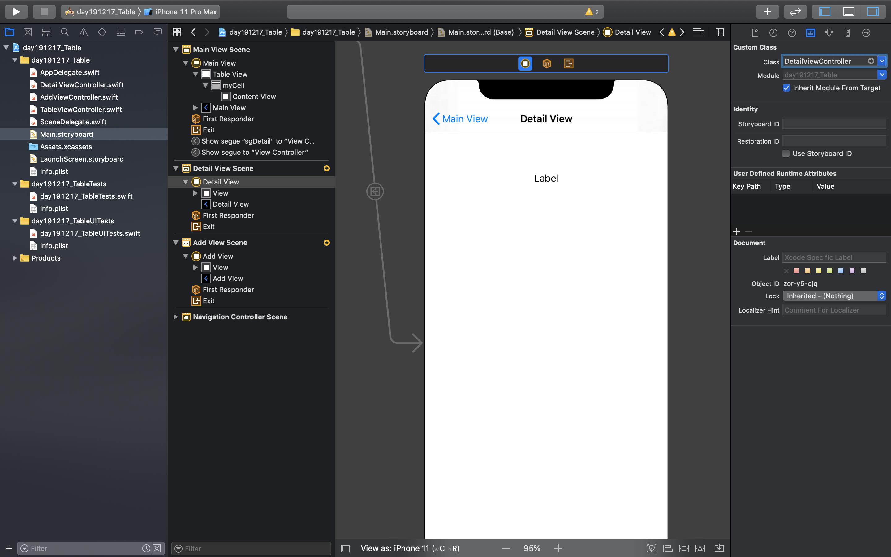 'Detail View' Controller -> Identity Inspector -> Custom Class -> Class -> 'DetailViewController' 선택