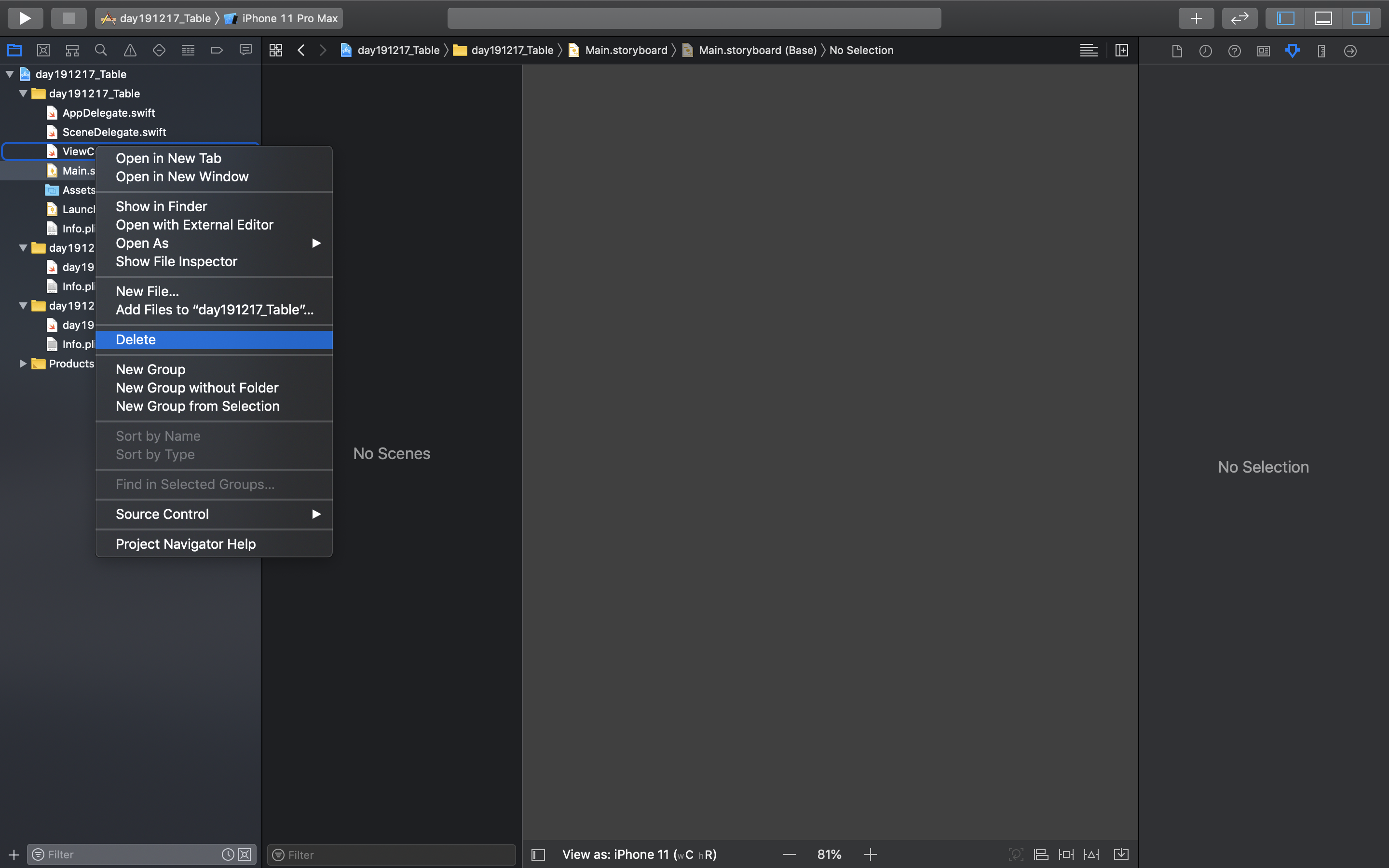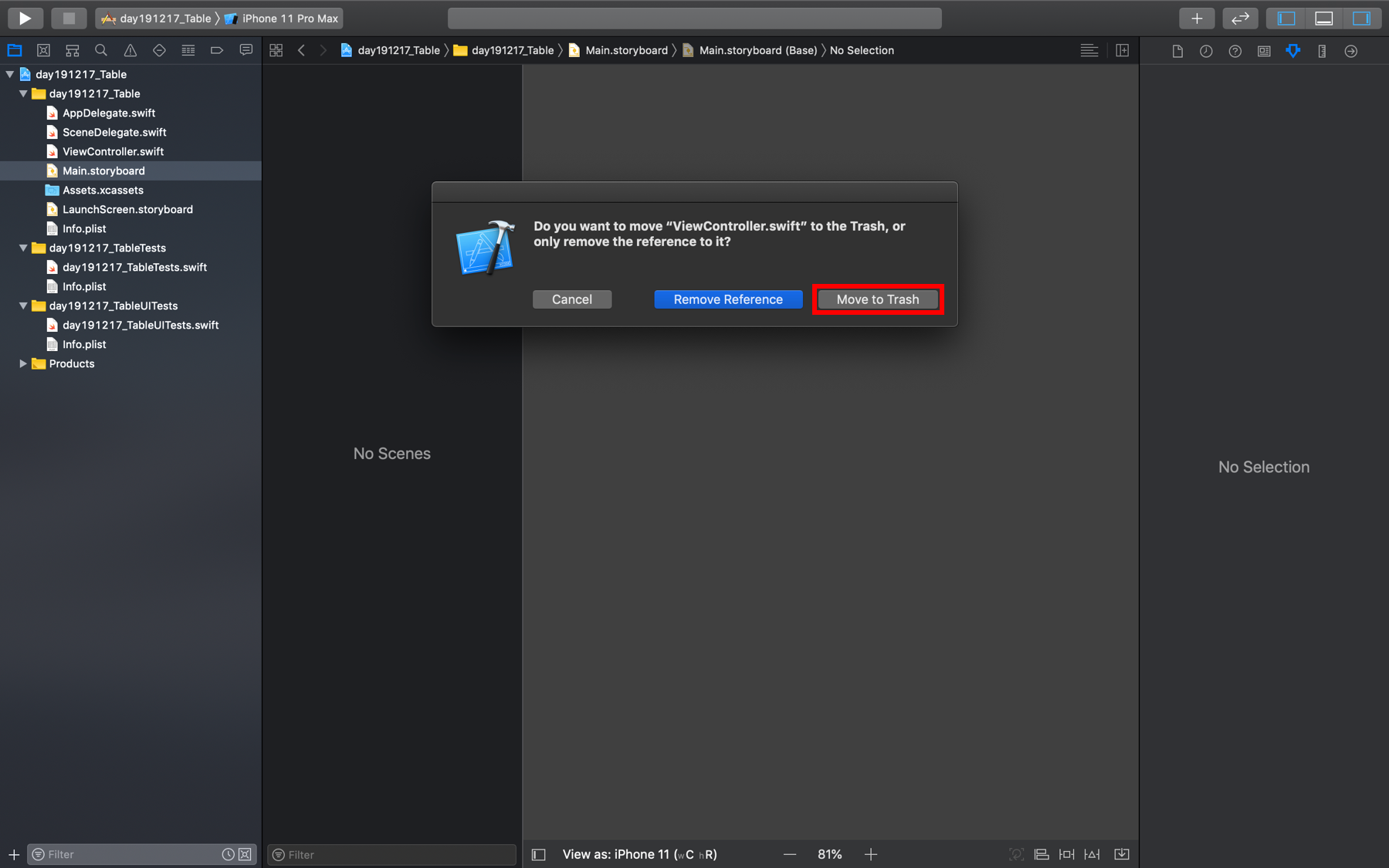 테이블 뷰 컨트롤러를 사용해야하므로 기존의 뷰 컨트롤러와 연결된 스위프트 파일을 삭제한다.