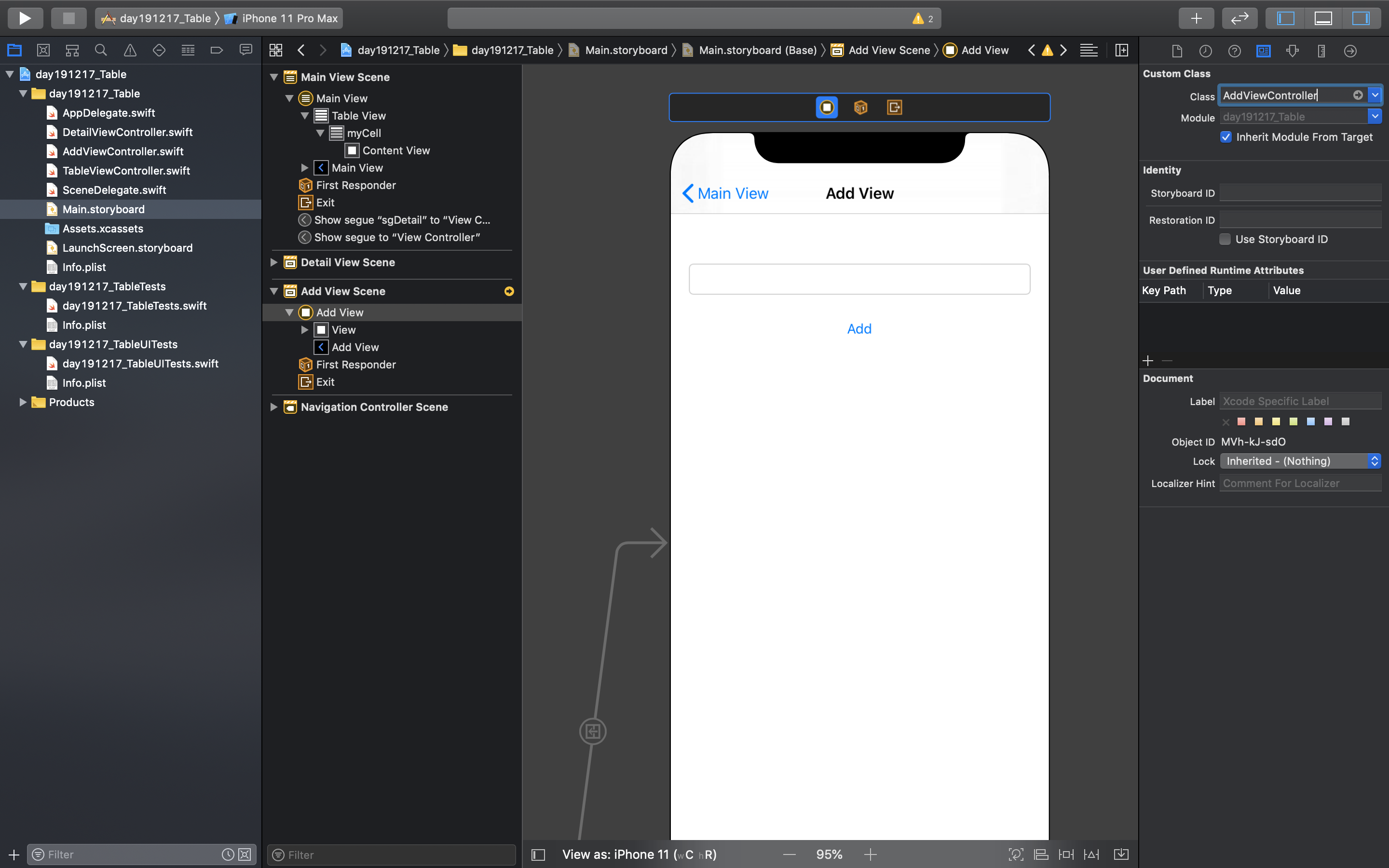 'Add View' Controller -> Identity Inspector -> Custom Class -> Class -> 'AddViewController' 선택