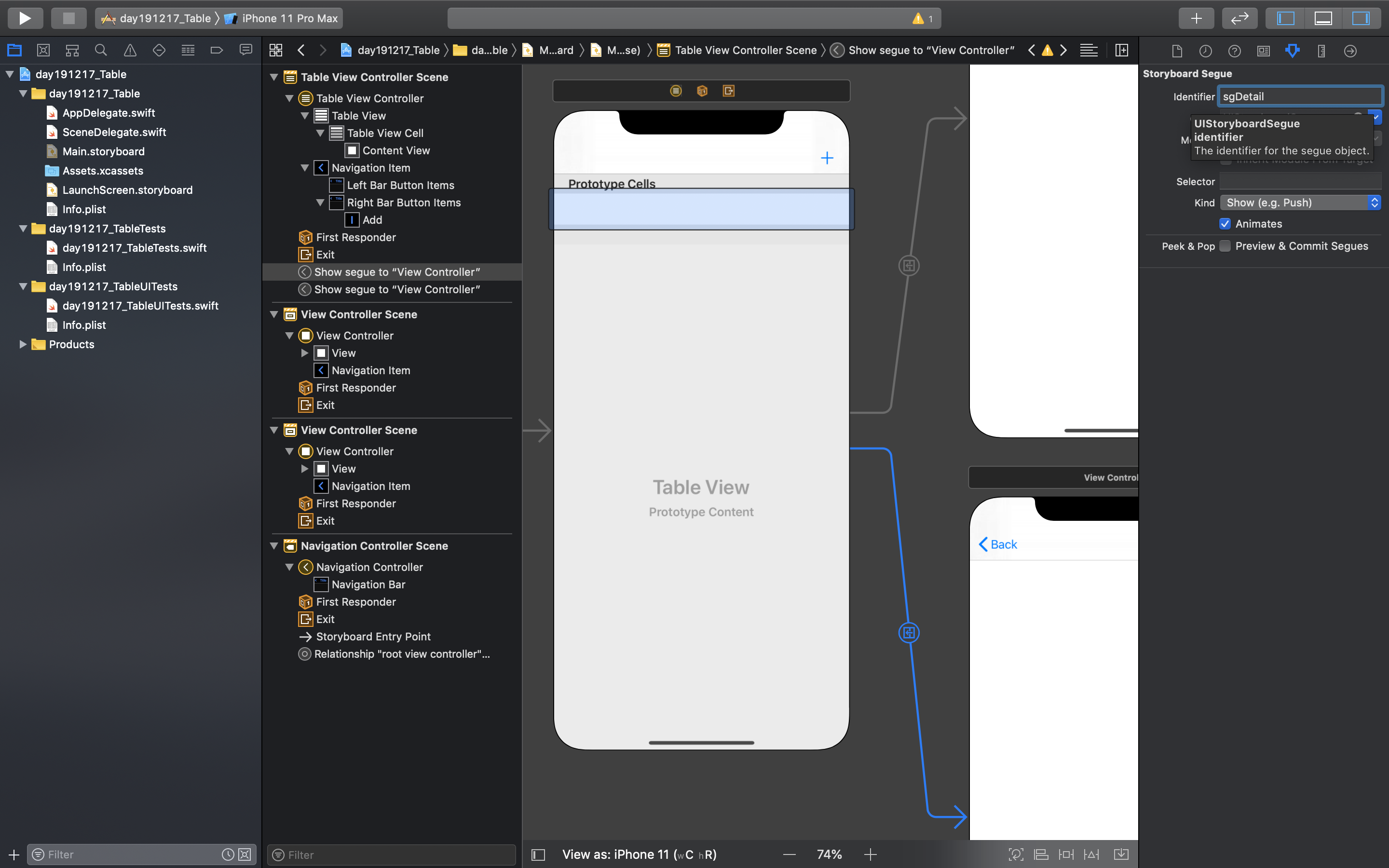 4) 아래 쪽 세그웨이(Segue) 선택 -> Attributes Inspector -> Identifier -> 'sgDetail' 입력