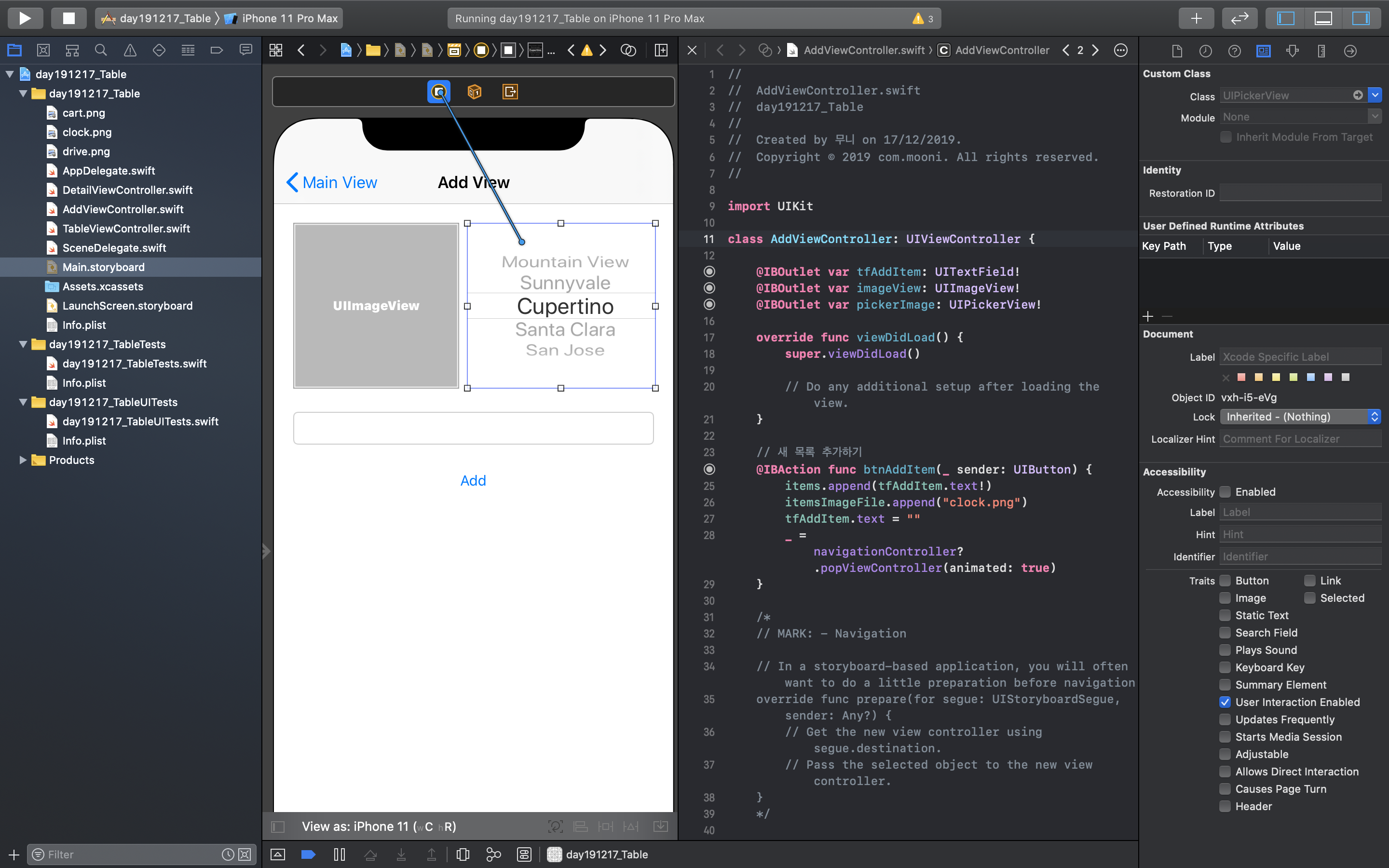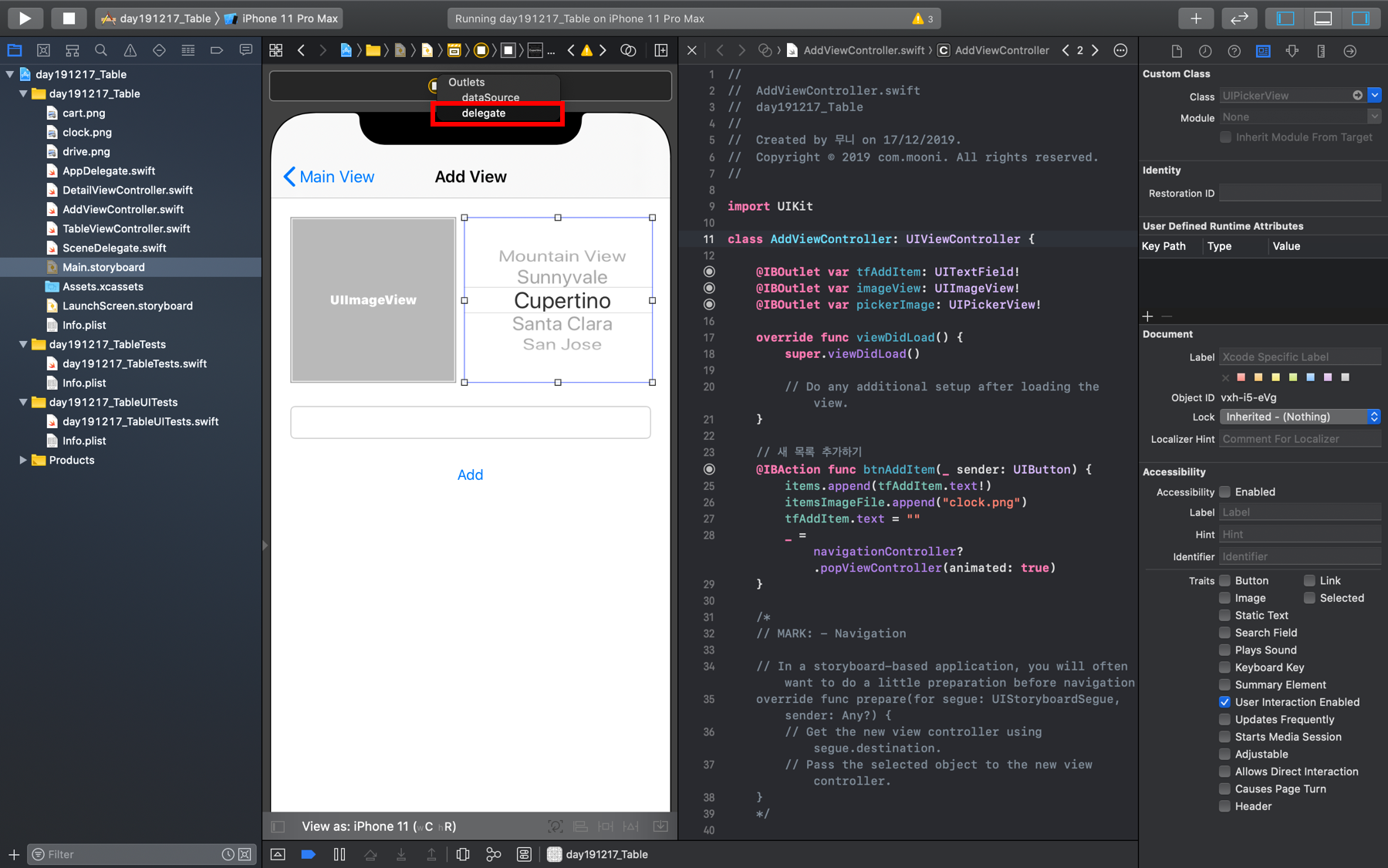 'Add View' 뷰 컨트롤러에 Pcker View의 delegate 연결한다.