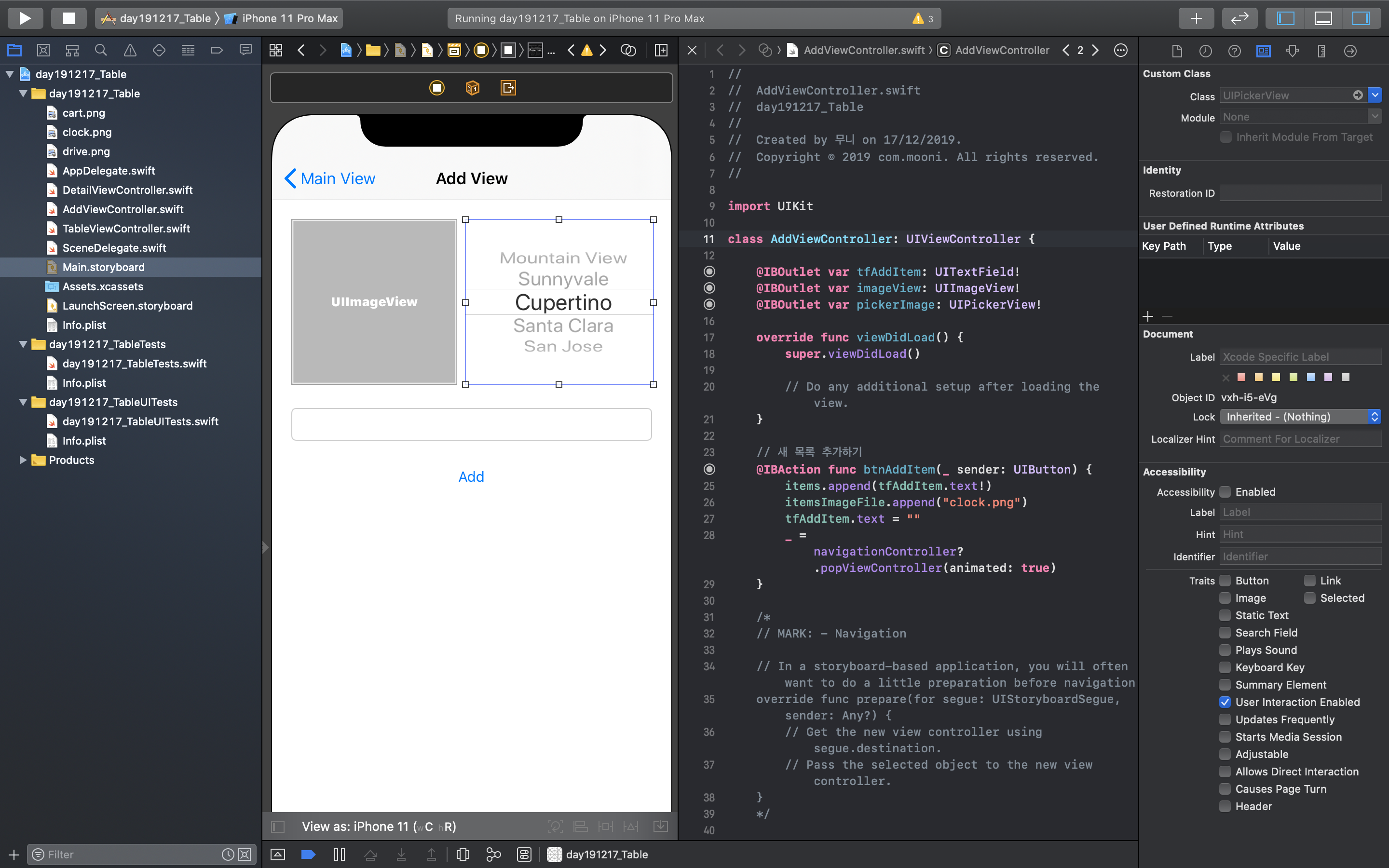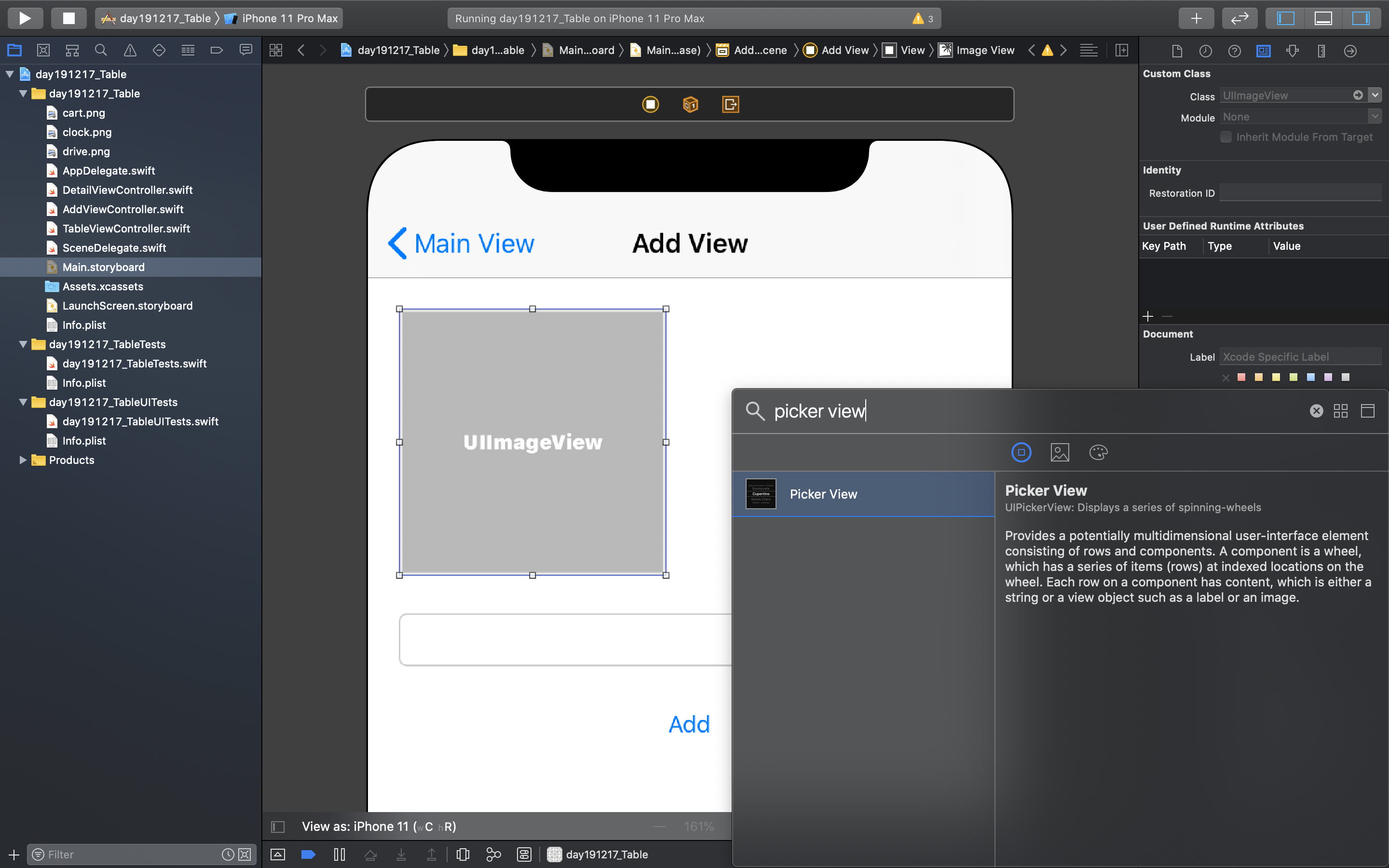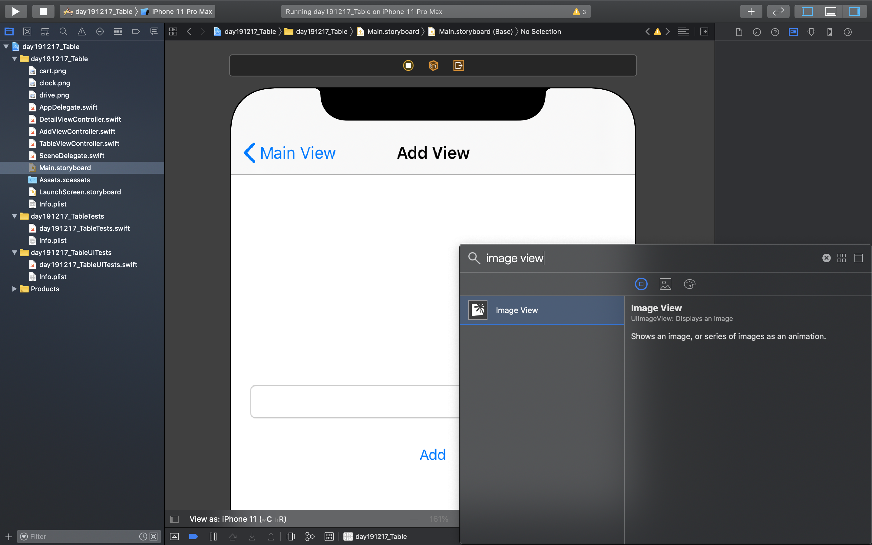 'Add View'(새로운 아이템을 추가하는 화면) 뷰 컨트롤러에 Image View, Picker View를 추가한다.
