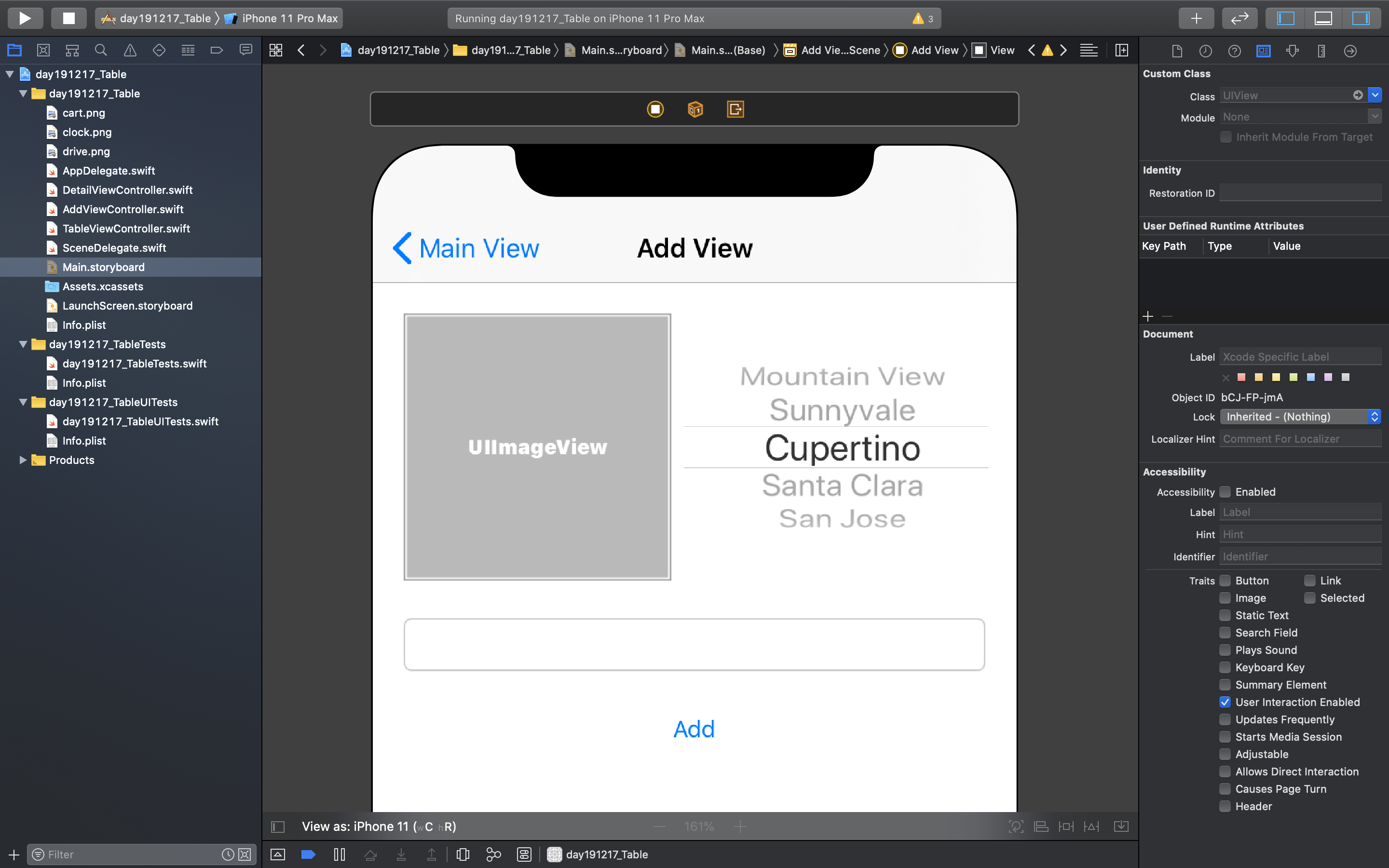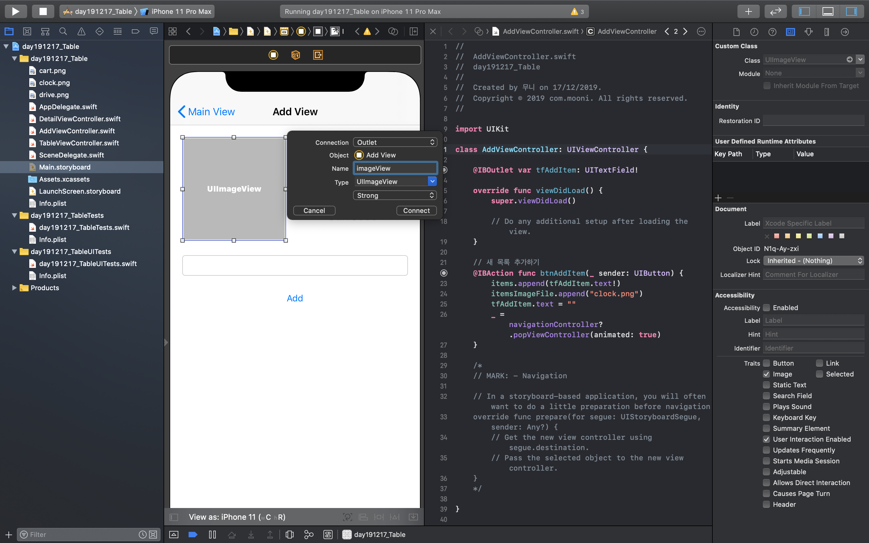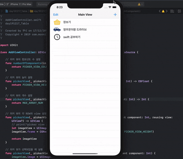 Xcode(버전11.3)를 이용하여 테이블 뷰 컨트롤러(Table View Controller) 할일 목록 앱을 만든다:) - 앱 화면 구성 1) 할 일 목록을 보여주는 화면 (Main View) 2) 할 일을 추가화는 화면(Add View) 3) 목록 중 한..