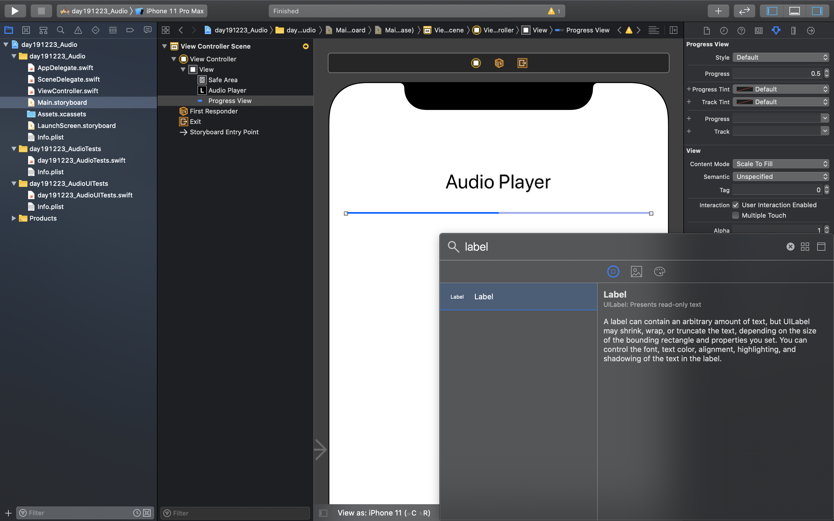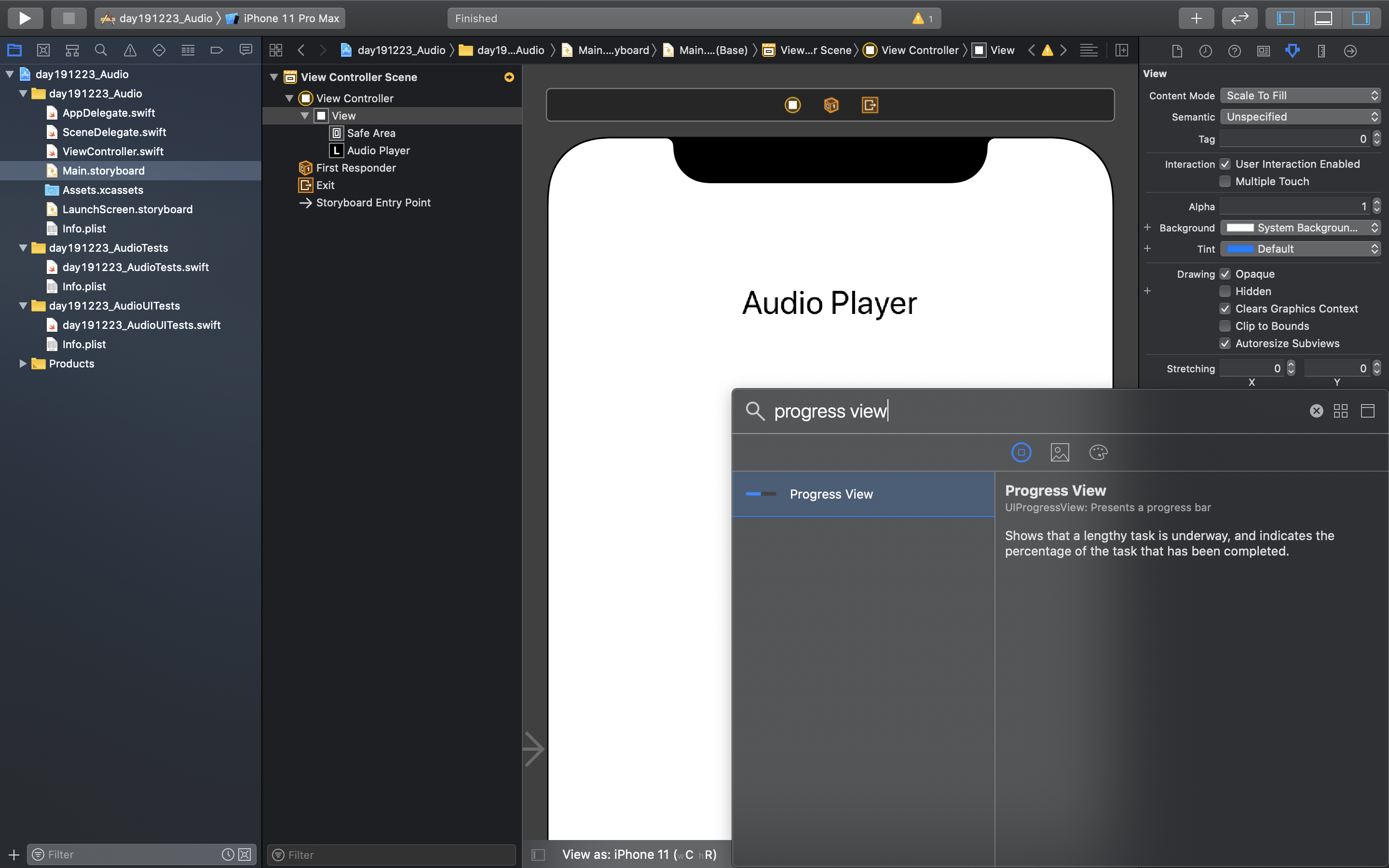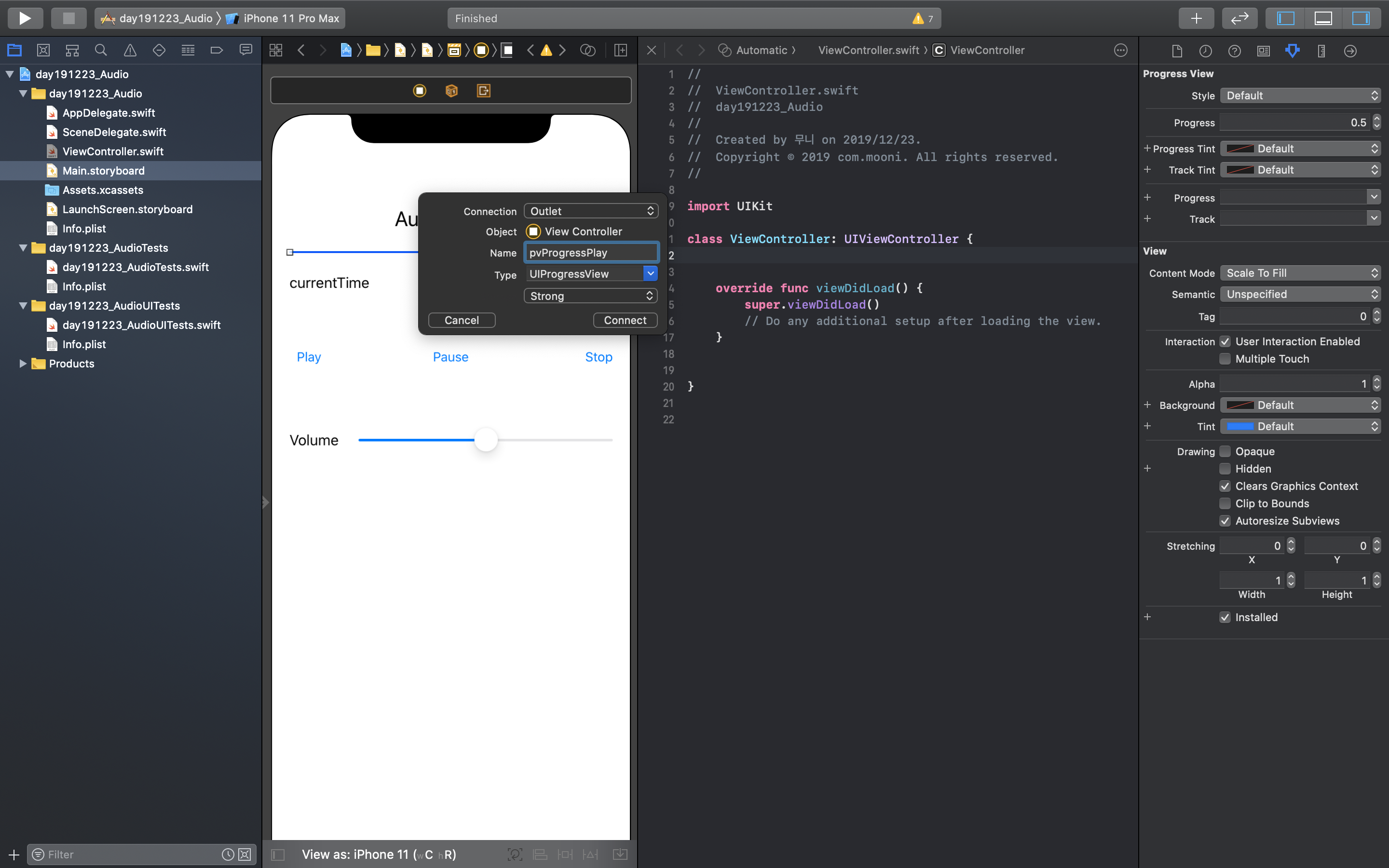 pvProgressPlay.progress = Float(audioPlayer.currentTime/audioPlayer.duration) // 프로그레스(Progress View)인 pvProgressPlay의 진행 상황에 audioPlayer.currentTime을 audioPlayer.duration으로 나눈 값으로 표시