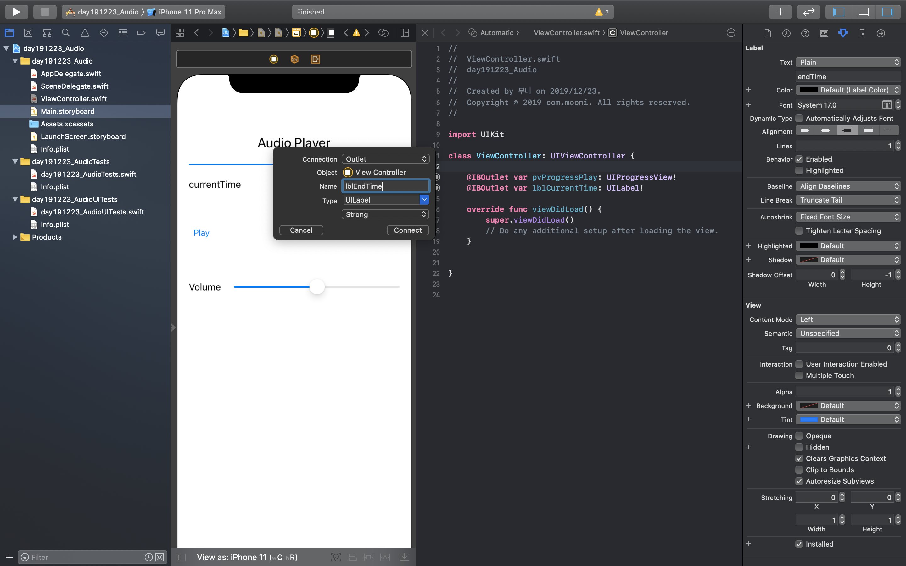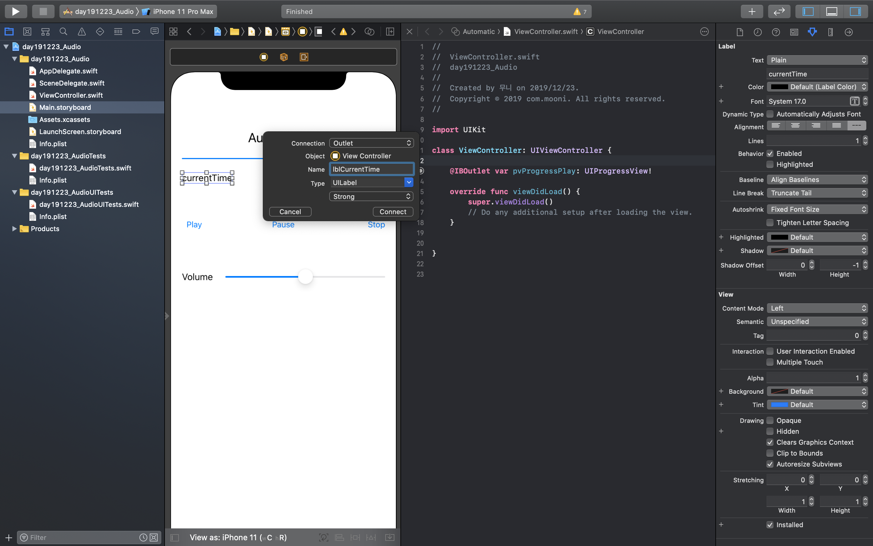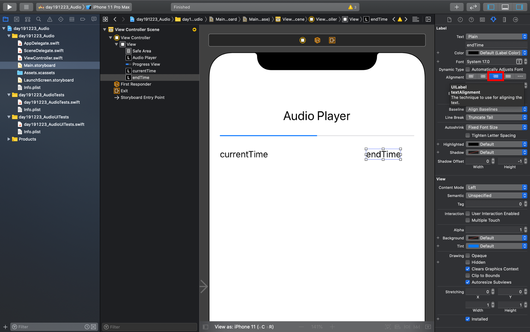 lblCurrentTime.text = convertNSTimeInterval12String(audioPlayer.currentTime) // 재생 시간인 audioPlayer.currentTime을 lblCurrentTime에 나타냄