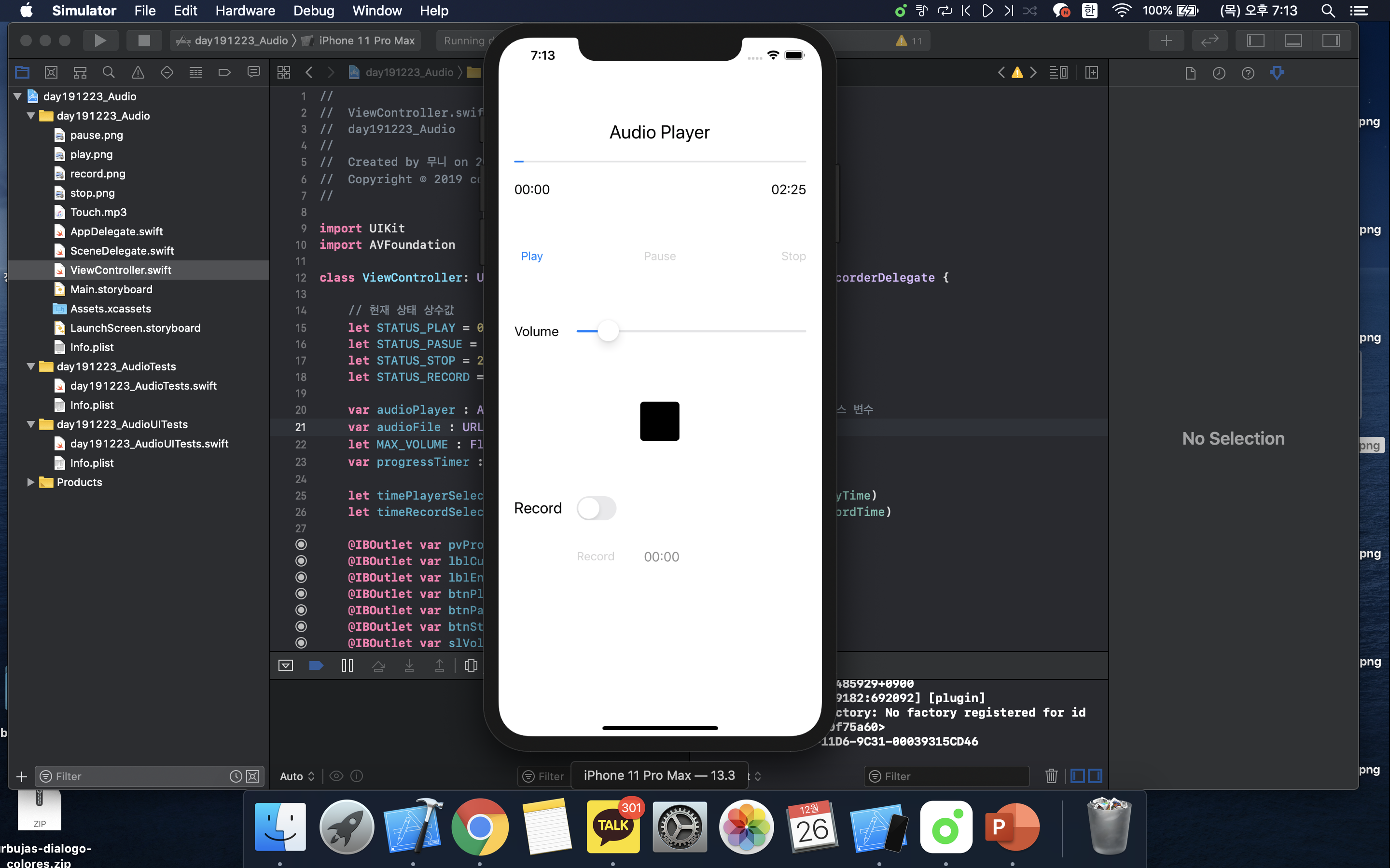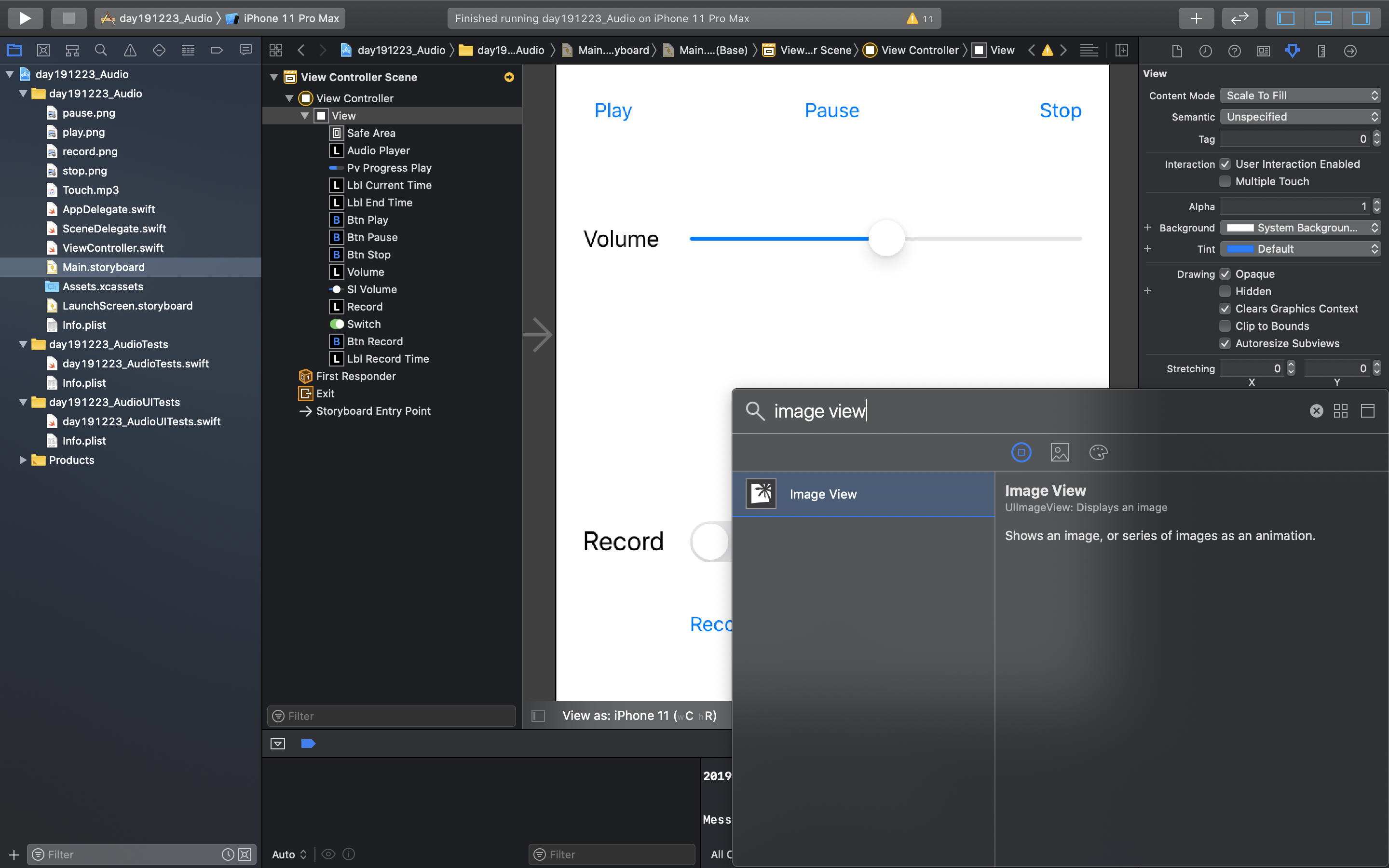 Xcode(버전11.3)를 AVAudioPlayer 음악(오디오) 재생 및 녹음 앱을 만든다:) AVAudioPlayer을 이용하여 아래 기능을 구현한다. 1. 오디오 파일을 재생, 일시정지, 정지 2. 볼륨 조절 3. 녹음 - 스토리보드 화면..