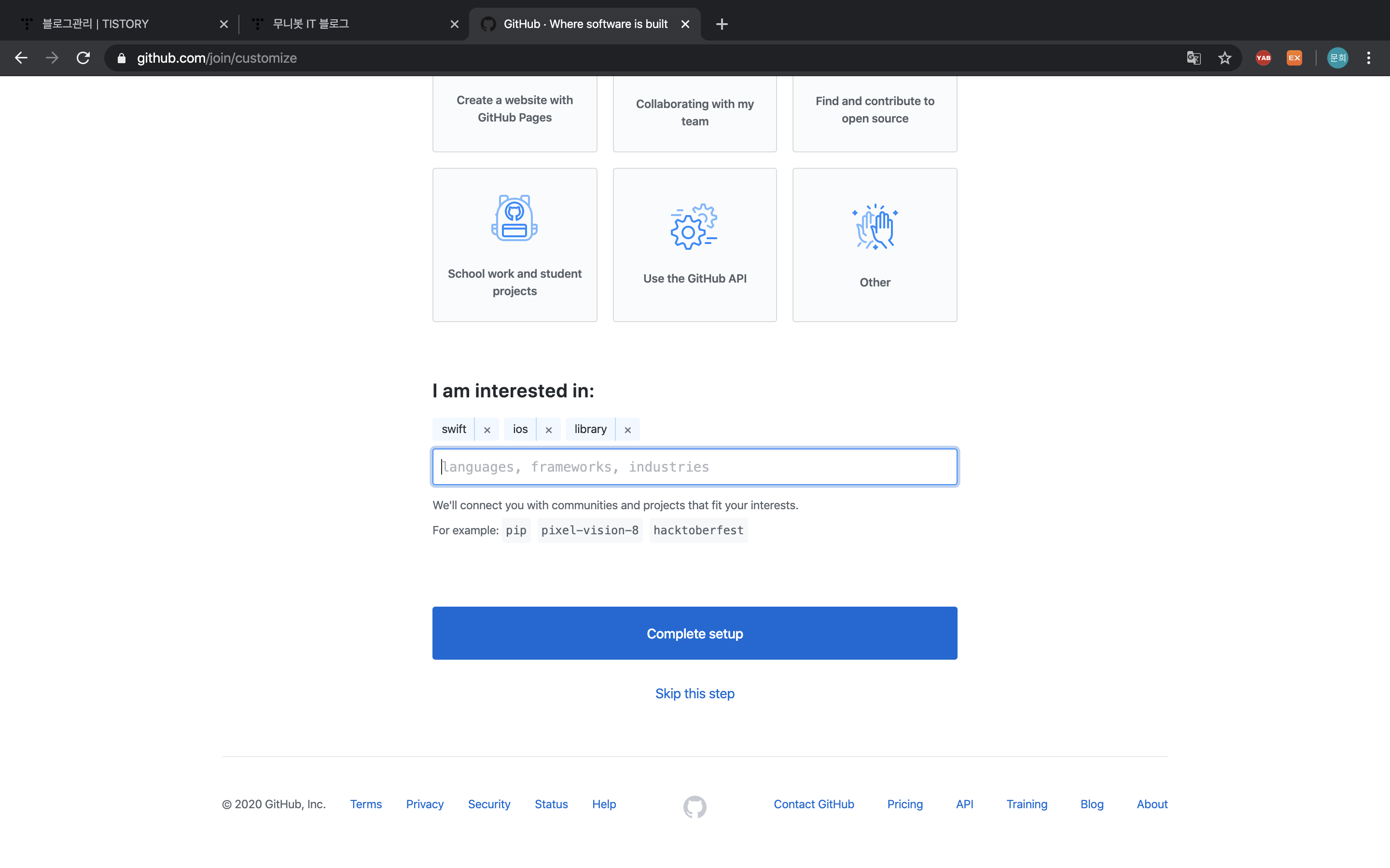 개발 경험이나 GitHub 사용 계획 등의 대한 답을 선택하고, 관심사를 입력한다.