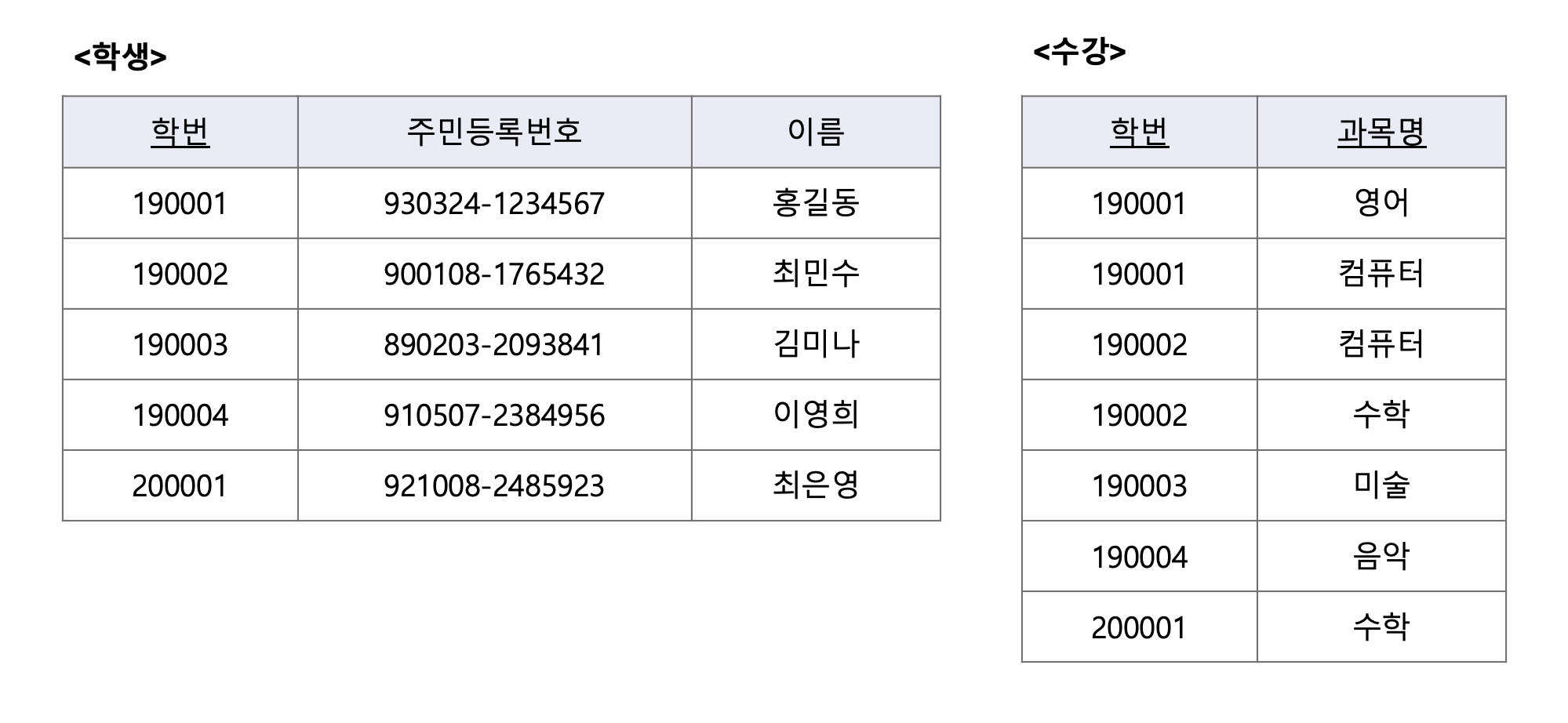 <학생> 릴레이션과 <수강> 릴레이션은 학번을 기준으로 관계가 설정된 것이다.