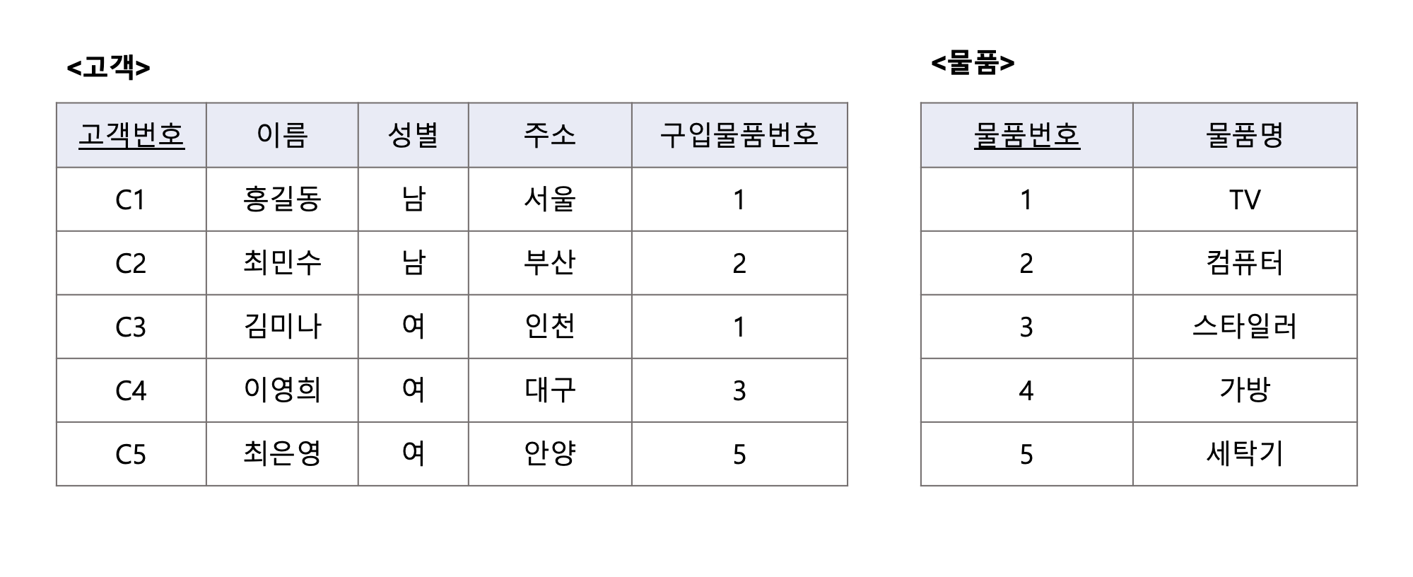<고객> 릴레이션의 구입물품번호 속성은 <물품> 릴레이션의 기본키인 물품번호를 참조하고 있기 때문에 외래키가 된다.