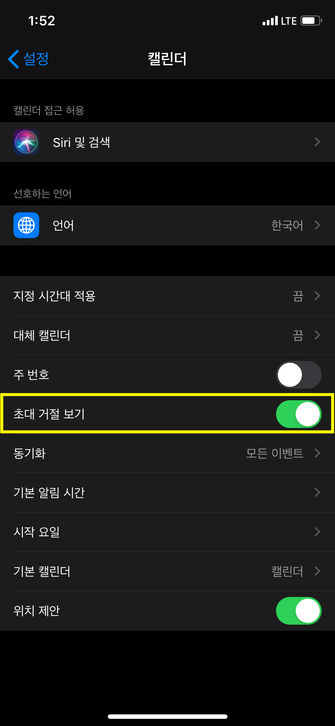 위 사진은 아이폰 설정 > 캘린더 화면 이다.